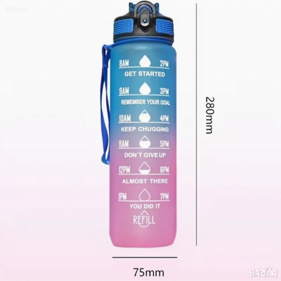 Технически характеристики на Мотивираща бутилка с мерителна скала 1L – контролирай дневния си прием на вода Ясни размери и функционалности за спокойно използване. Капацитет: 1 л Височина: 28 см Диаметър: 7,5 см Херметично уплътнение: предотвратява протичане и запазва чантата суха Почасова скала: маркирани часове и мотивационни послания за лесно следене на дневния прием Подходяща за: ежедневна употреба вкъщи, на работа, в кухнята или при спортни занимания НЕ СА НАЛИЧНИ ЩЕ СЕ ПОРЪЧАТ СЛЕД КАТО СЕ СЪБЕРЕ 10 ПОРЪЧКИ
