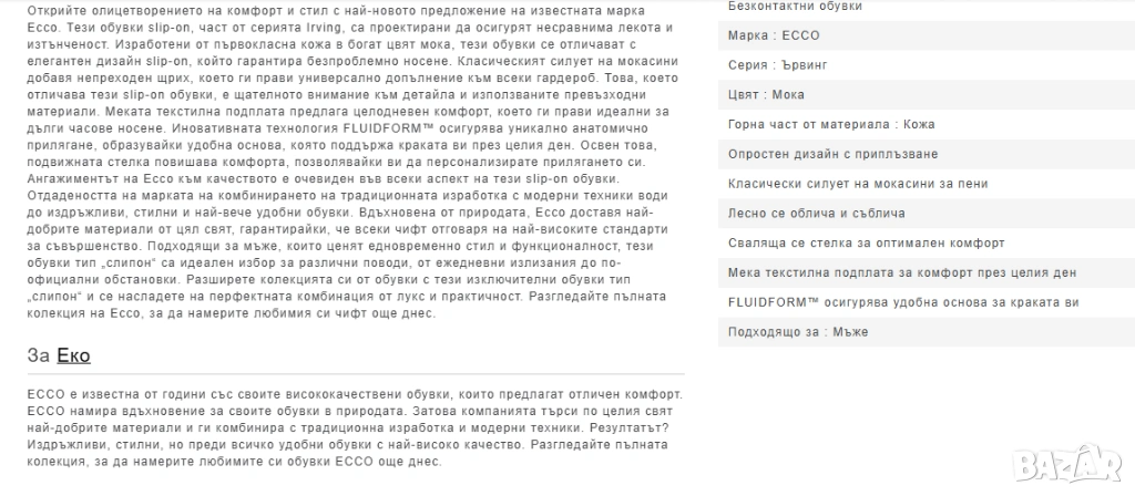 Открийте олицетворението на комфорт и стил с най-новото предложение на известната марка Ecco. Тези обувки slip-on, част от серията Irving, са проектирани да осигурят несравнима лекота и изтънченост. Изработени от първокласна кожа в богат цвят мока, тези обувки се отличават с елегантен дизайн slip-on, който гарантира безпроблемно носене. Класическият силует на мокасини добавя непреходен щрих, което ги прави универсално допълнение към всеки гардероб. Това, което отличава тези slip-on обувки, е щателното внимание към детайла и използваните превъзходни материали. Меката текстилна подплата предлага целодневен комфорт, което ги прави идеални за дълги часове носене. Иновативната технология FLUIDFORM™ осигурява уникално анатомично прилягане, образувайки удобна основа, която поддържа краката ви през целия ден. Освен това, подвижната стелка повишава комфорта, позволявайки ви да персонализирате прилягането си. Ангажиментът на Ecco към качеството е очевиден във всеки аспект на тези slip-on обувки. Отдадеността на марката на комбинирането на традиционната изработка с модерни техники води до издръжливи, стилни и най-вече удобни обувки. Вдъхновена от природата, Ecco доставя най-добрите материали от цял свят, гарантирайки, че всеки чифт отговаря на най-високите стандарти за съвършенство. Подходящи за мъже, които ценят едновременно стил и функционалност, тези обувки тип „слипон“ са идеален избор за различни поводи, от ежедневни излизания до по-официални обстановки. Разширете колекцията си от обувки с тези изключителни обувки тип „слипон“ и се насладете на перфектната комбинация от лукс и практичност. Разгледайте пълната колекция на Ecco, за да намерите любимия си чифт още днес.