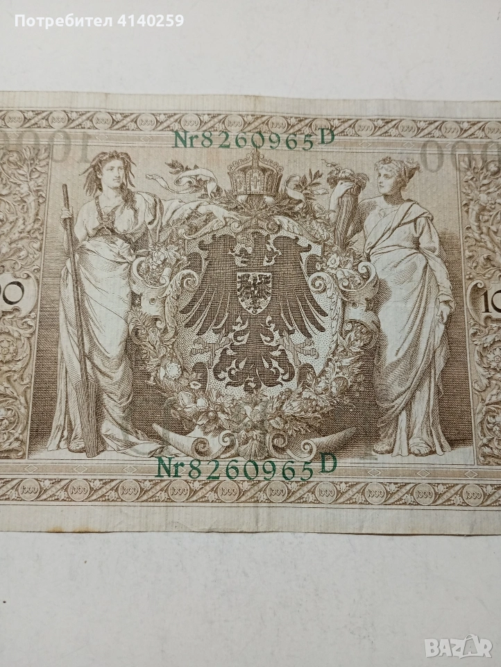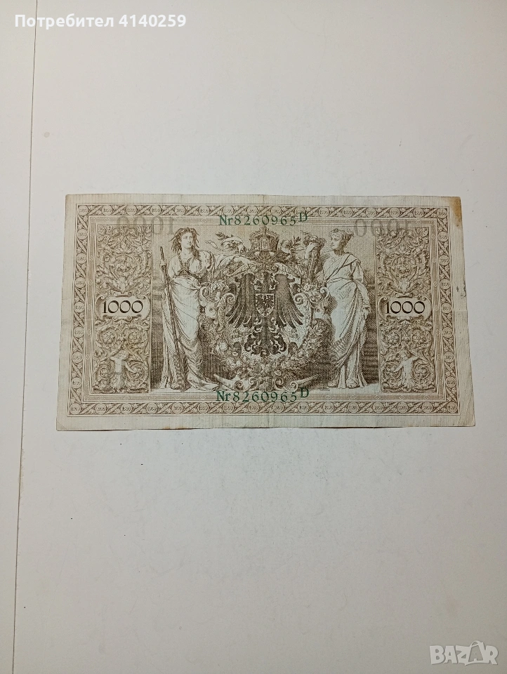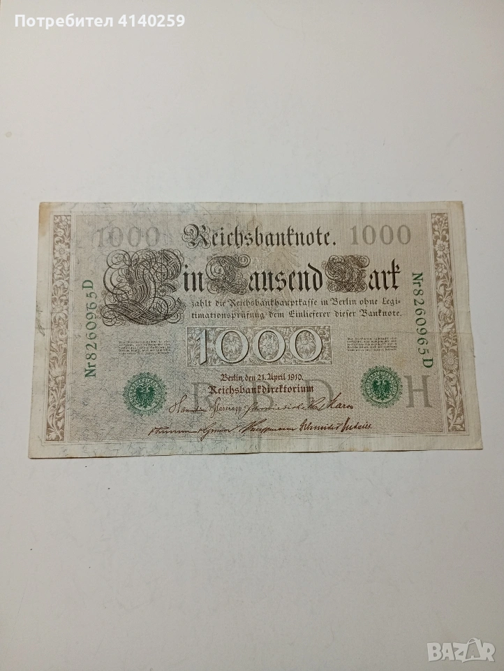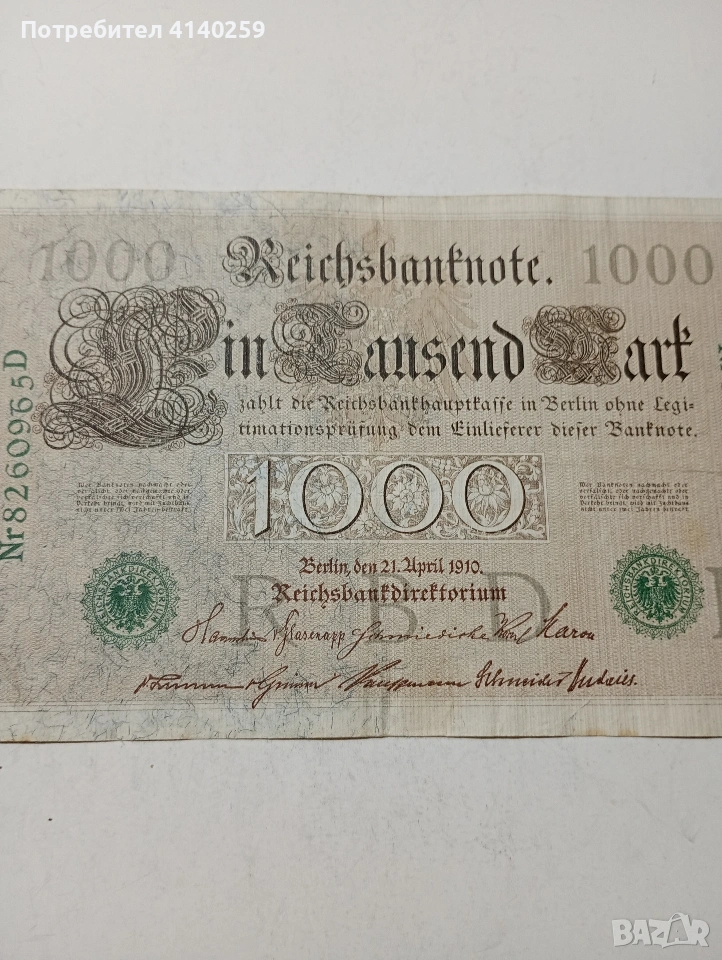 ГЕРМАНИЯ БАНКНОТА 1000 МАРКИ 1910 Г СЪСТОЯНИЕ ВИДИМО ПОЛУЧАВАТЕ СНИМАНАТА БАНКНОТА РАЗГЛЕДАЙТЕ ДРУГИТЕ МИ ОБЯВИ ДА КОМБИНИРАТЕ ДОСТАВКА ЕКОНТ ЗА ВАРНА ЛИЧНО