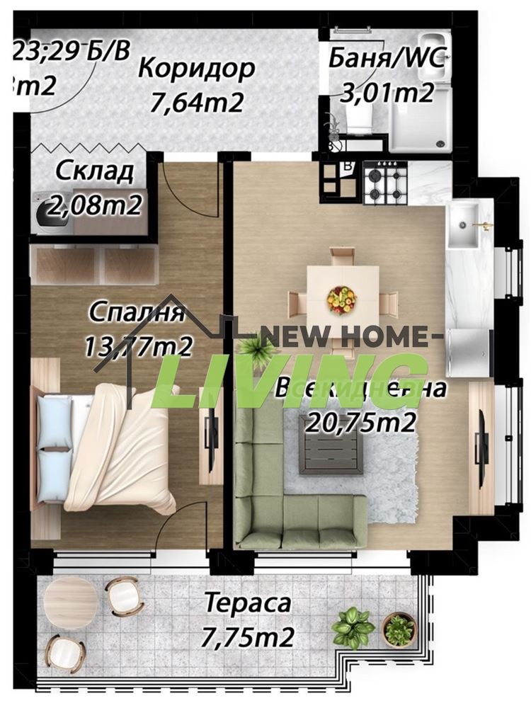 Жилището е функционално разпределено и включва: