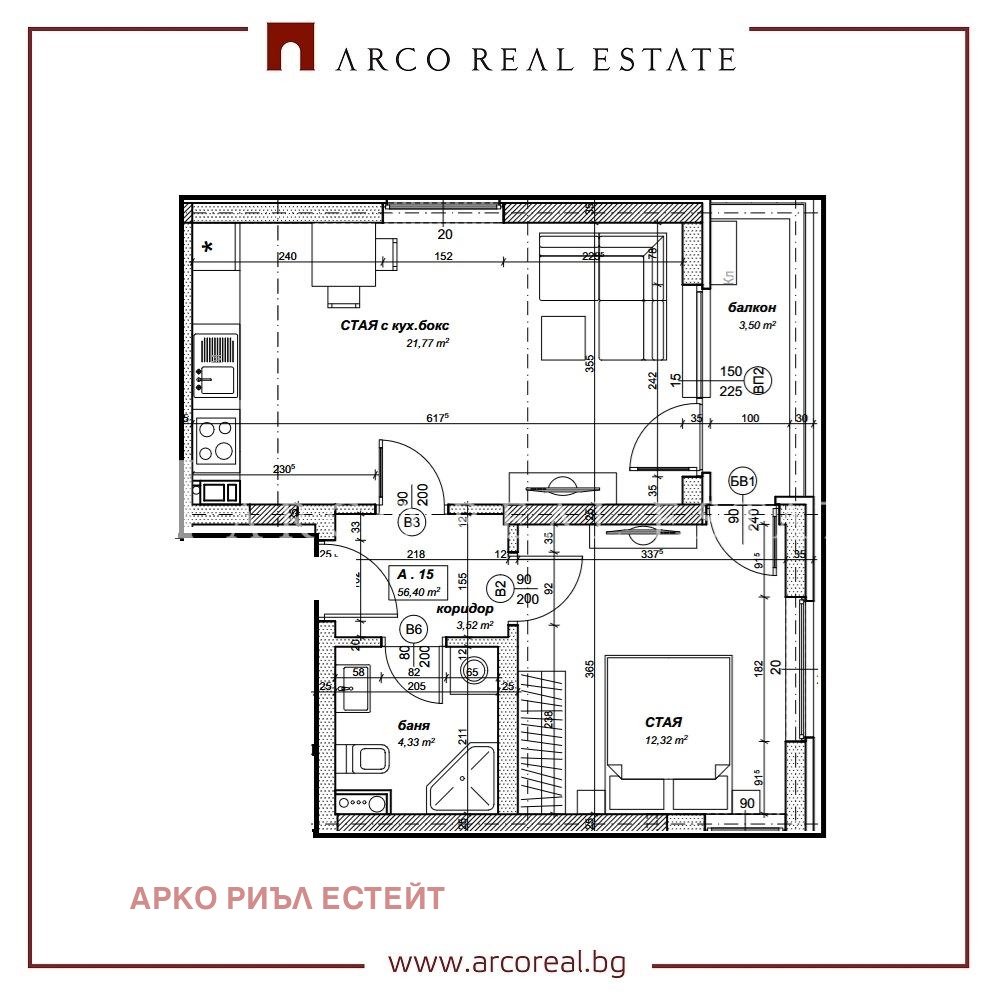 Ателие 15 е двустаен на ет.1-ви над партер със застроена площ 56.40 кв.м.