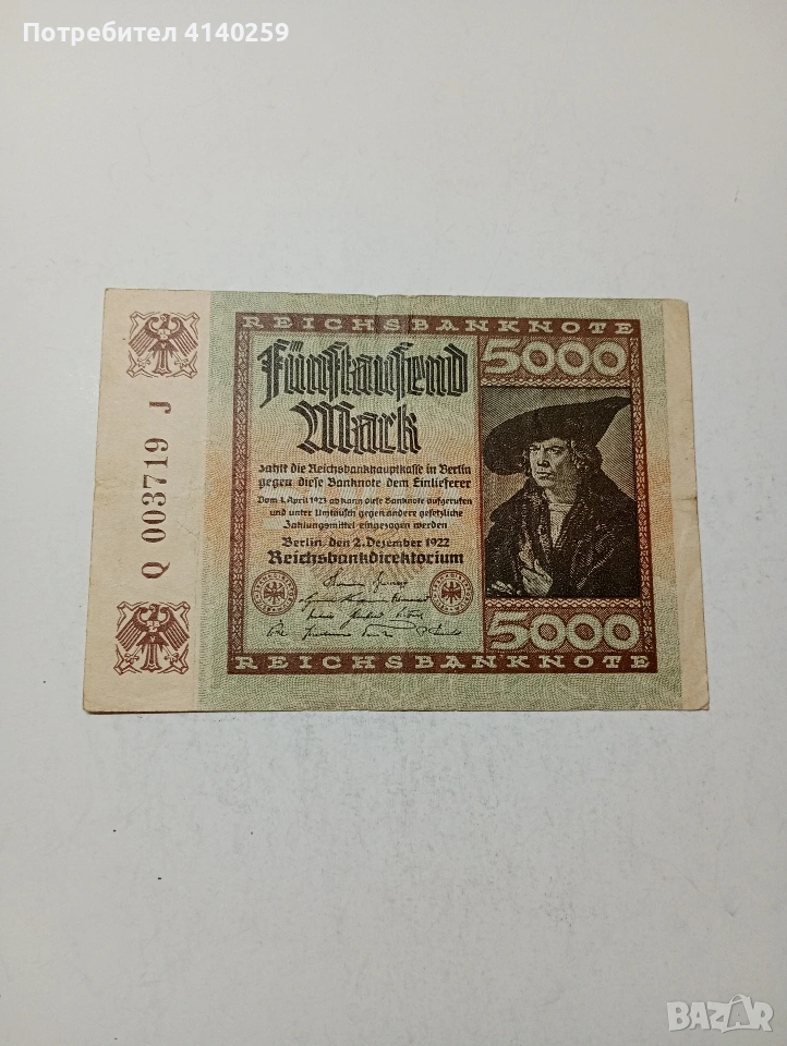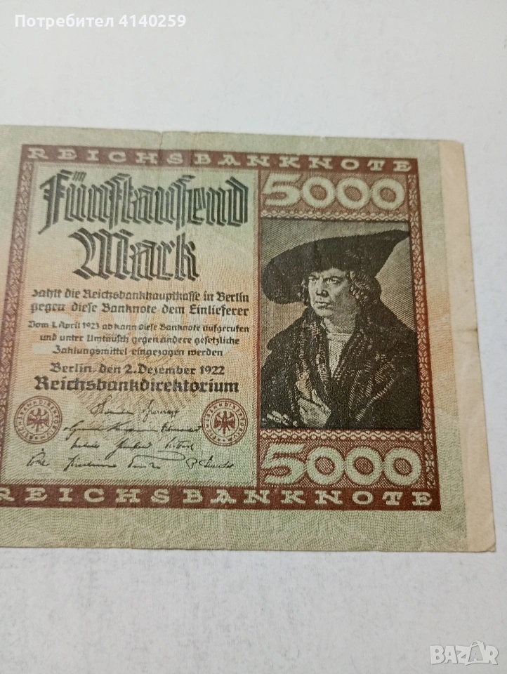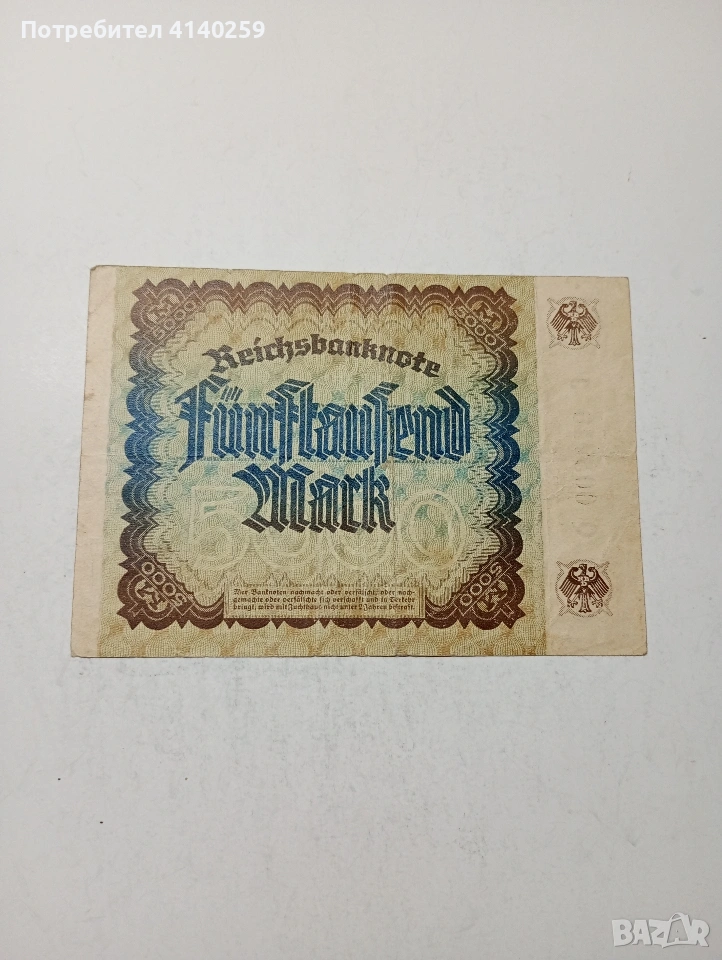 ГЕРМАНИЯ БАНКНОТА 5,000 МАРКИ 1922 Г СЪСТОЯНИЕ ВИДИМО ПОЛУЧАВАТЕ СНИМАНАТА БАНКНОТА РАЗГЛЕДАЙТЕ ДРУГИТЕ МИ ОБЯВИ ДА КОМБИНИРАТЕ ДОСТАВКА ЕКОНТ ЗА ВАРНА ЛИЧНО