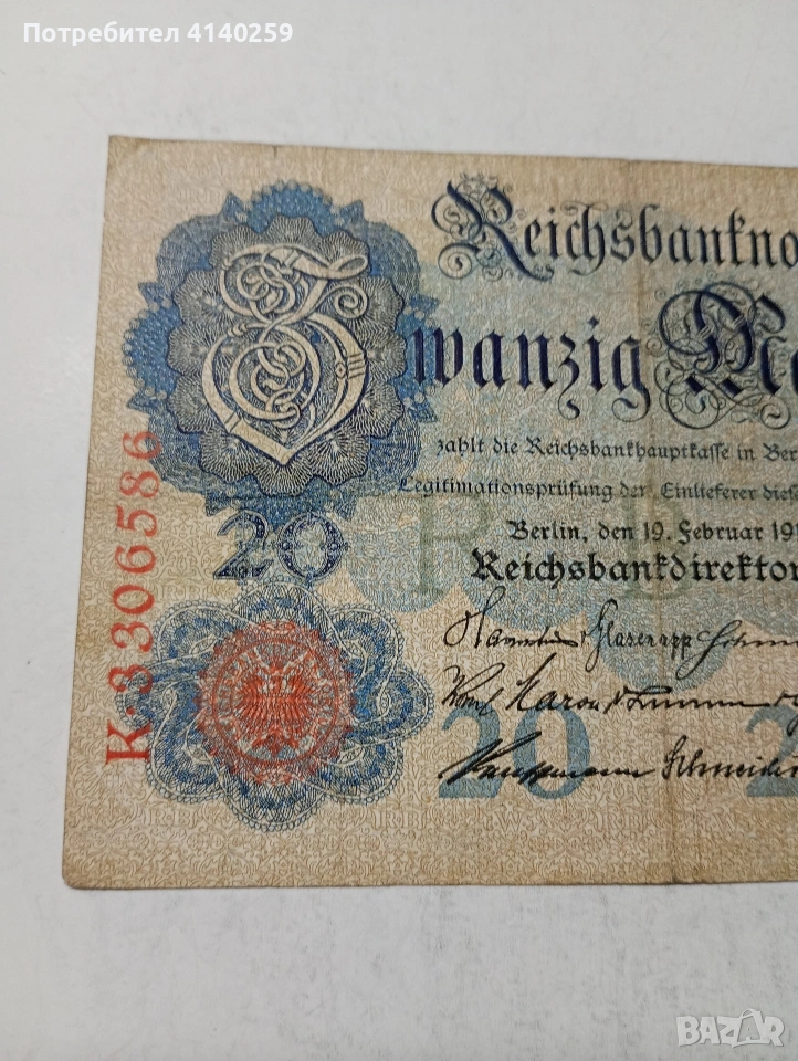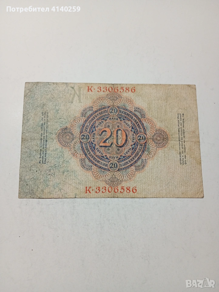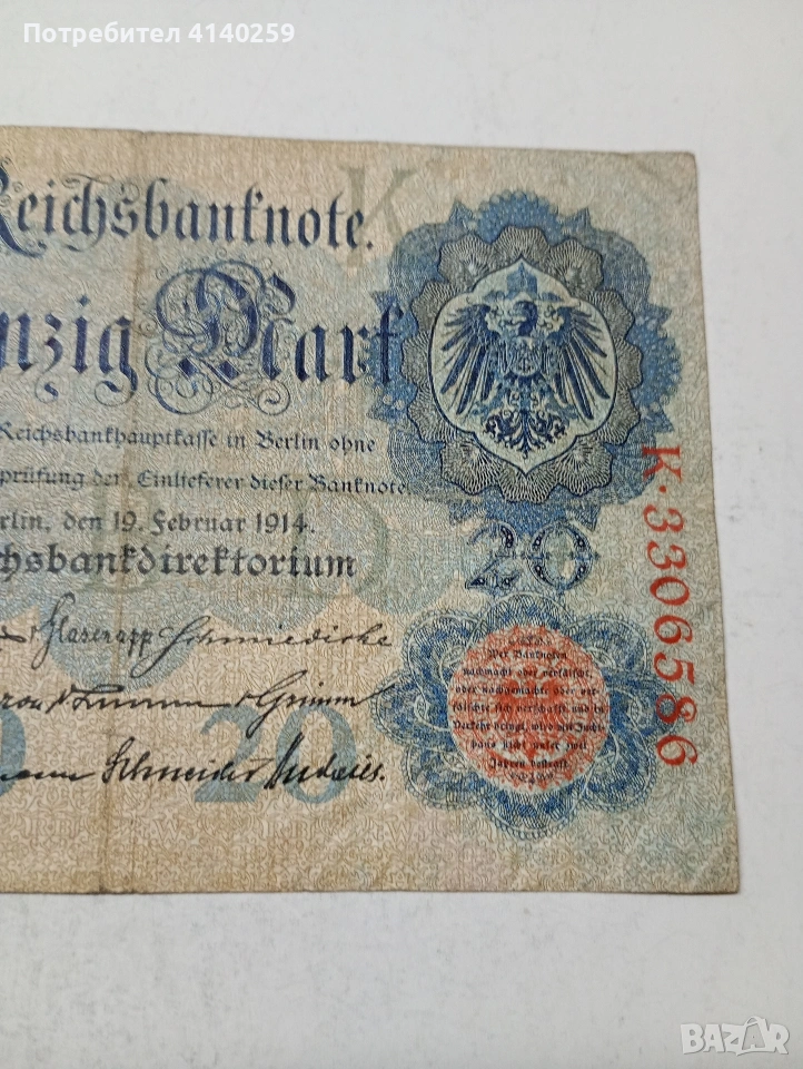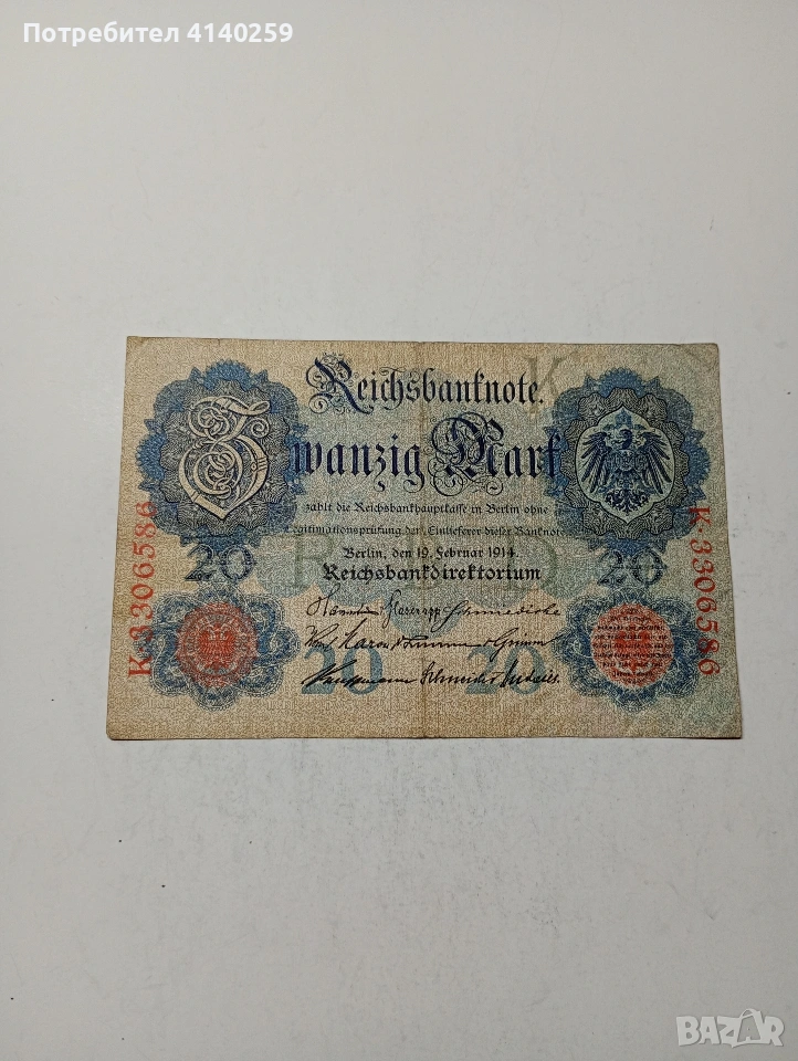ГЕРМАНИЯ БАНКНОТА 20 МАРКИ 1914 Г СЪСТОЯНИЕ ВИДИМО ПОЛУЧАВАТЕ СНИМАНАТА БАНКНОТА РАЗГЛЕДАЙТЕ ДРУГИТЕ МИ ОБЯВИ ДА КОМБИНИРАТЕ ДОСТАВКА ЕКОНТ ЗА ВАРНА ЛИЧНО