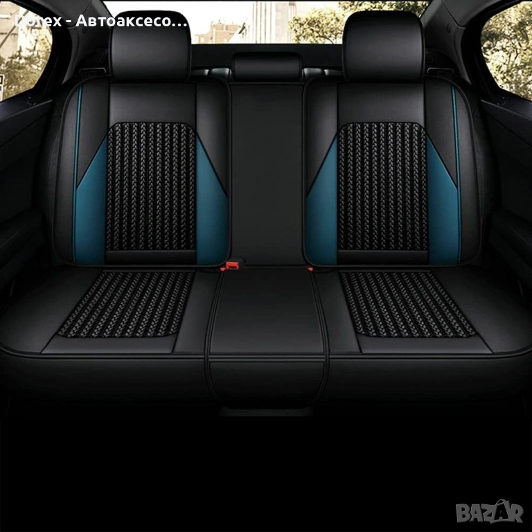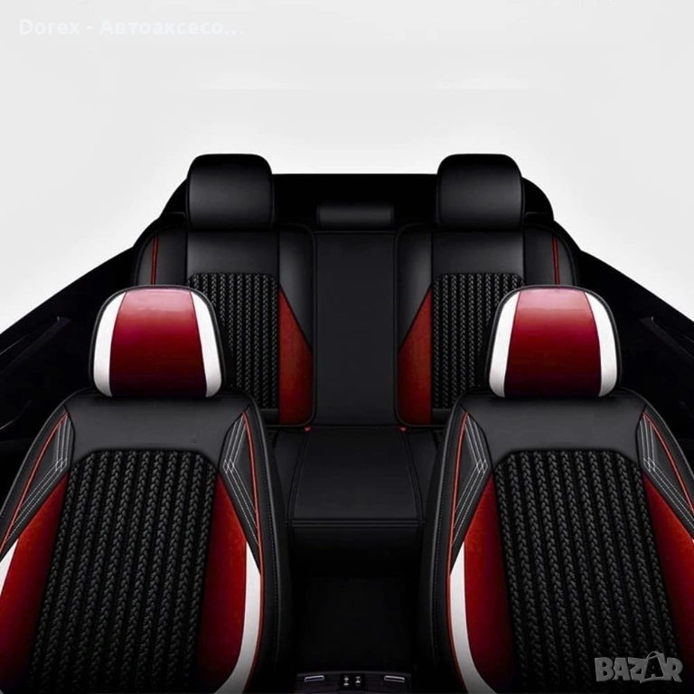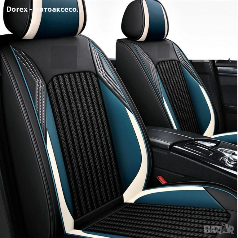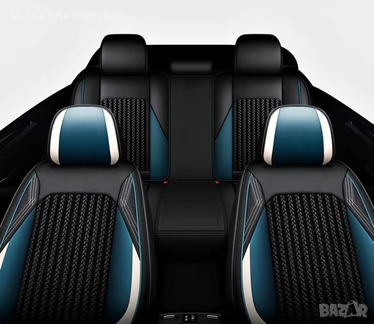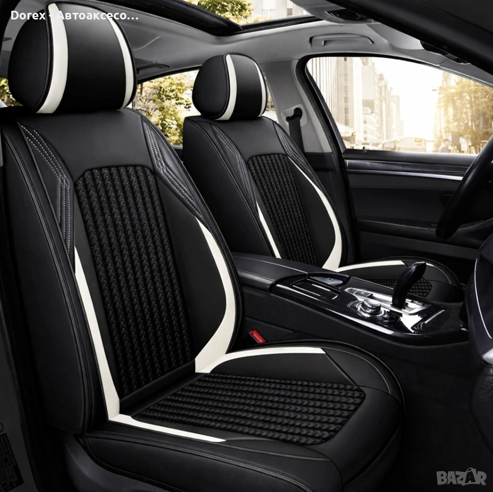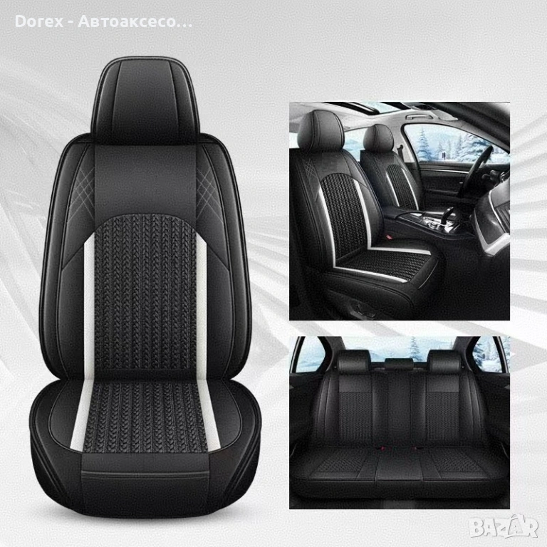 Висококачествен комплект универсални калъфи за автомобилни седалки, изработени от комбинация от еко кожа, пяна и дишащ текстил за максимален комфорт и стил.