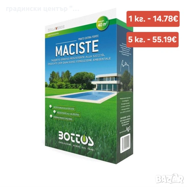 MACISTE (Шампионът на жегата): Най-издръжливата смес на суша, слънце и газене. Не оставя шанс на плевелите.