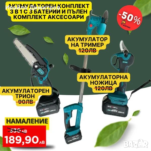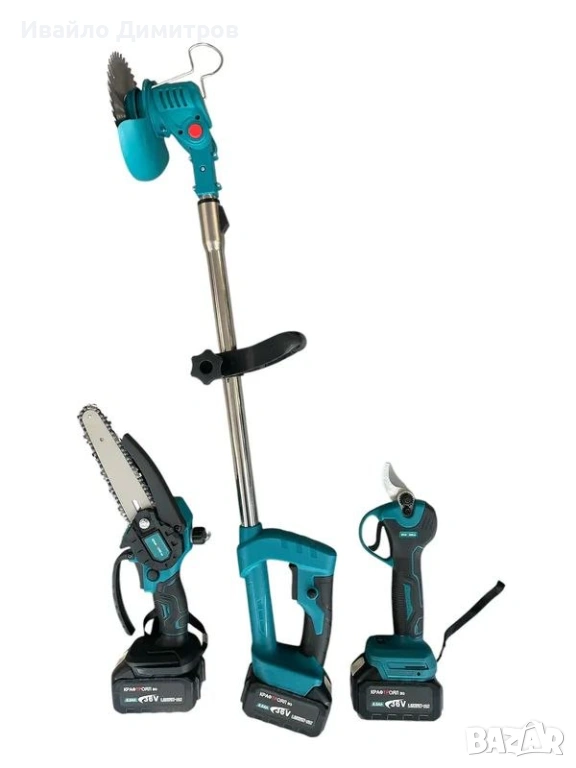 Комплект от акумулаторна лозарска ножица, мини верижен трион с 15 см шина, маслен филтър, 2 вериги и акумулаторен тример за трева 3 в 1 36V 8Ah KraftRoyal