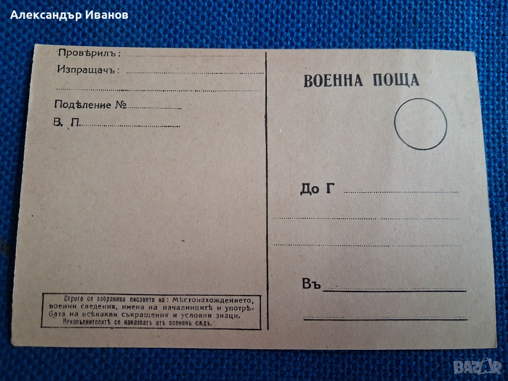Стара картичка Военна поща, снимка 1 - Нумизматика и бонистика - 54216600 Стара картичка Военна поща, снимка 2 - Нумизматика и бонистика - 54216600 Стара картичка Военна поща, снимка 3 - Нумизматика и бонистика - 54216600 1/3