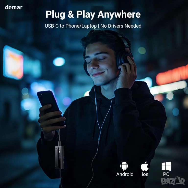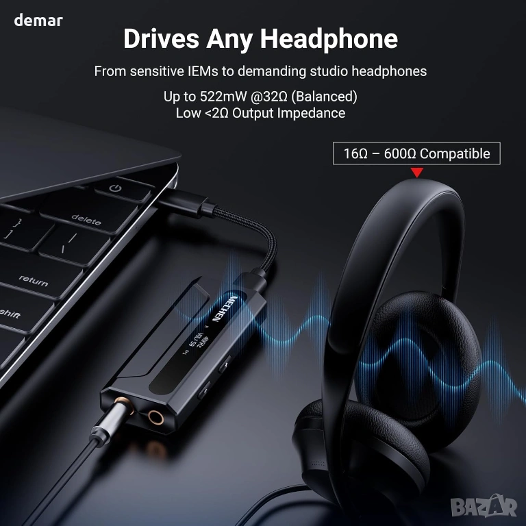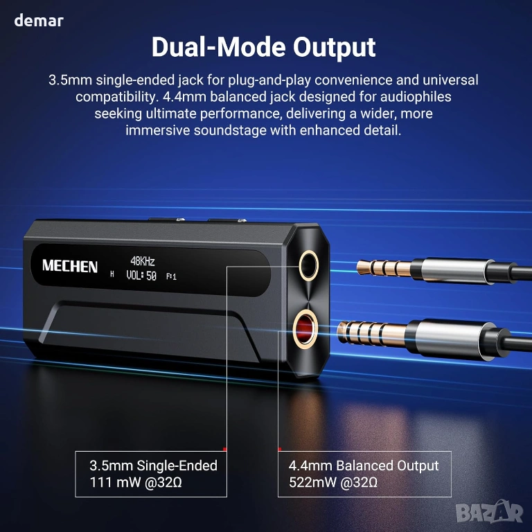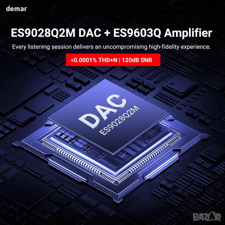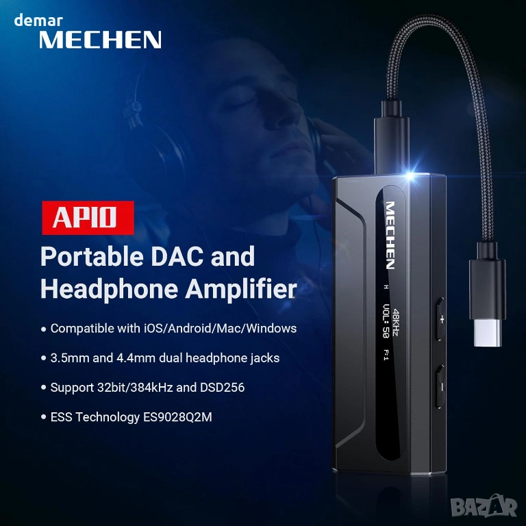 Компактен преносим ЦАП и усилвател за слушалки, осигуряващ висококачествен звук с усъвършенстван чипсет ESS Sabre, поддържащ възпроизвеждане с ултра висока резолюция и произвеждащ чист, детайлен звук с минимален шум и изкривявания. Оборудван с 3,5 мм и 4,4 мм изходи, той осигурява силна изходна мощност, подходяща за широк спектър от слушалки, като същевременно поддържа тих фон и висока яснота на сигнала. Проектиран за лесна употреба с лесно plug-and-play управление, плавно многостепенно управление на силата на звука и функция за памет за удобство. Високо съвместим със смартфони, таблети и компютри, функциониращ както като ЦАП, така и като външна звукова карта. Изработен с издръжлив метален корпус, обработен с CNC машина, предлагащ солиден, удароустойчив дизайн с удобен захват.