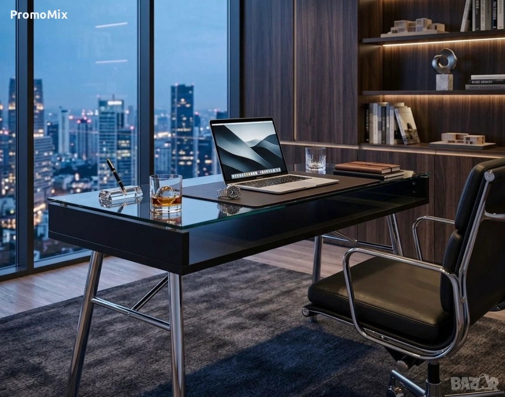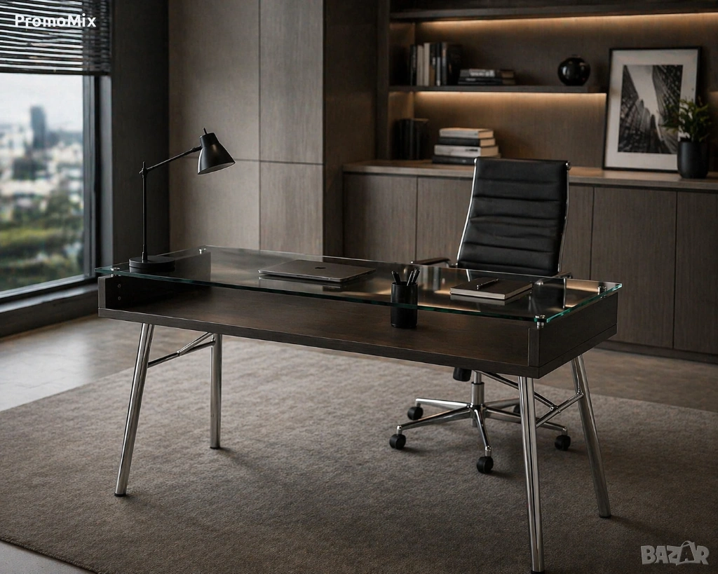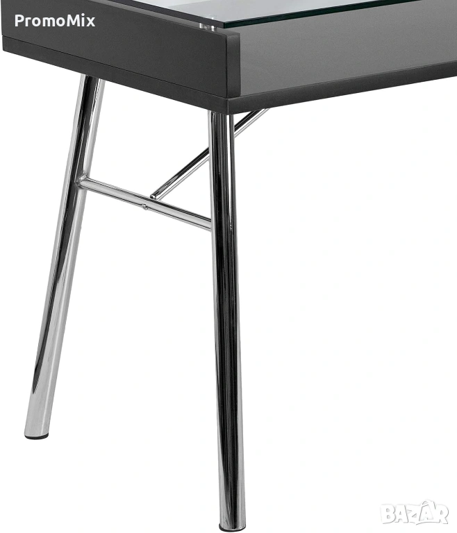 Под стъкления плот е разположен практичен отворен рафт с масивна основа от ПДЧ, като осигурява удобно пространство за съхранение на документи, офис консумативи, декорация и др.