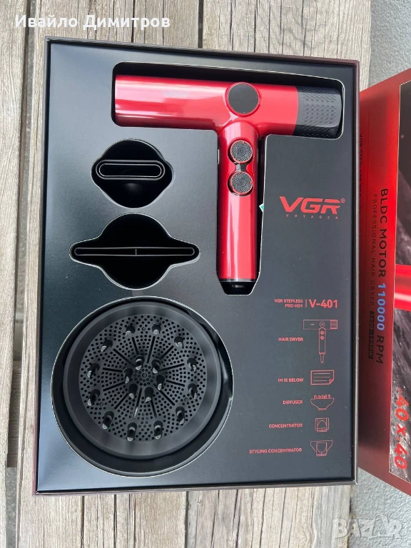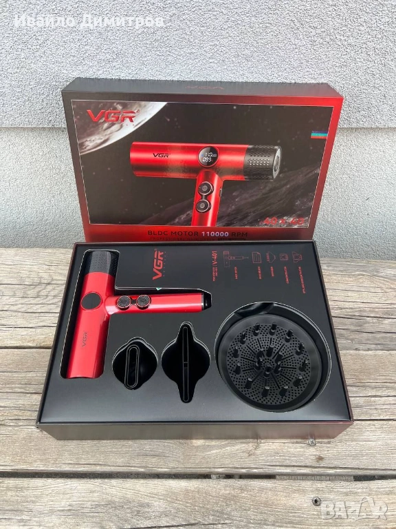 VGR V-401 е мощен и модерен професионален сешоар, създаден за бързо сушене и прецизно стилизиране както в салон, така и у дома. Оборудван с високоефективен BLDC мотор, уредът достига до 110 000 оборота в минута, осигурявайки силна въздушна струя, по-кратко време за сушене и по-добър контрол при оформяне на прическата.