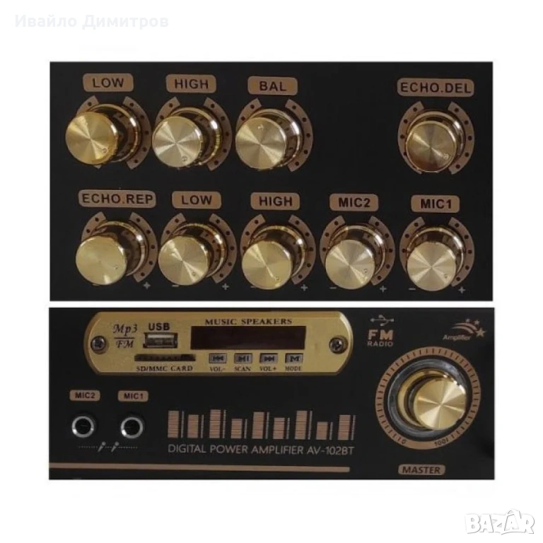 Bluetooth усилвател UKC AV-102BT е интегриран стерео усилвател с изходи за 5 високоговорителя, с вграден аудио плейър, с Bluetooth, USB, FM приемник и Караоке. Възпроизвежда звук чрез Bluetooth, от SD карти, от USB устройства и от външни източници на сигнал (компютър, телефон, CD плейър. Усилвателят се захранва от 220V, има дистанционно.
