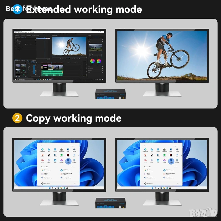【KVM превключвател за два монитора】 Този KVM превключвател за два дисплея ви позволява да използвате комплект клавиатура и мишка за управление на 2 компютъра, да споделяте 4 USB устройства и 2 монитора, както и да поддържате режим на копиране и режим на разширение (изисква се компютърът ви да има 2 HDMI порта). Режим на копиране: два монитора извеждат една и съща картина, режим на разширение: два монитора извеждат различни картини. Забележка: Превключването с клавишни комбинации не се поддържа.
