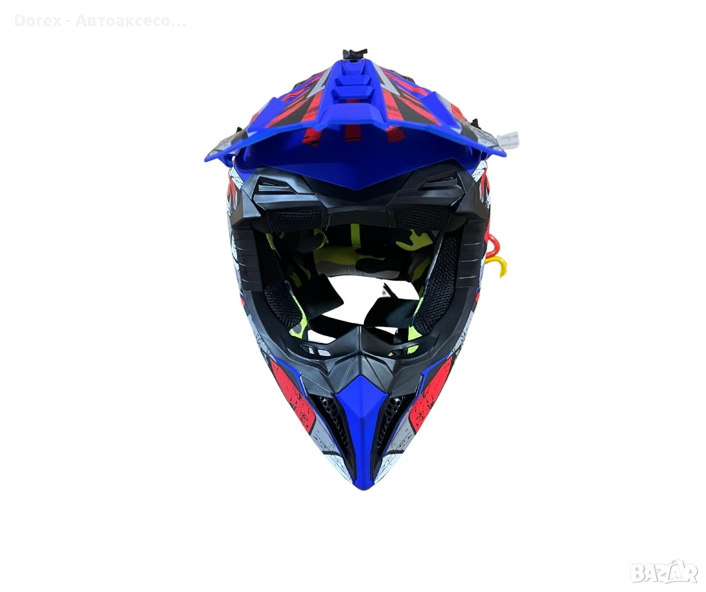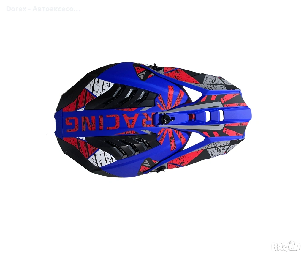 Модерният агресивен дизайн в синьо с червени графики осигурява отлична видимост и спортна визия.