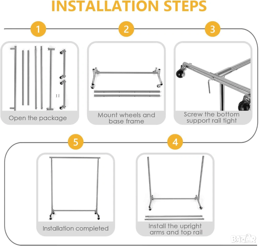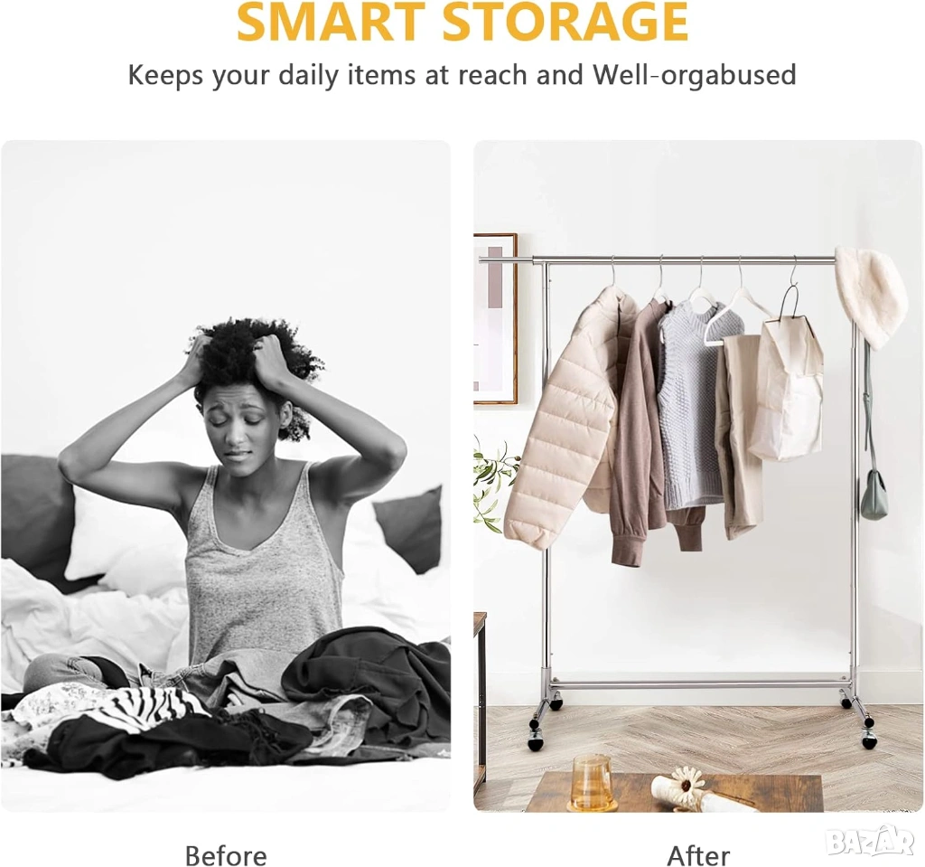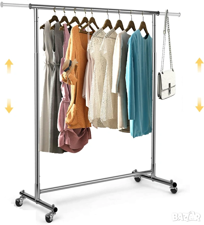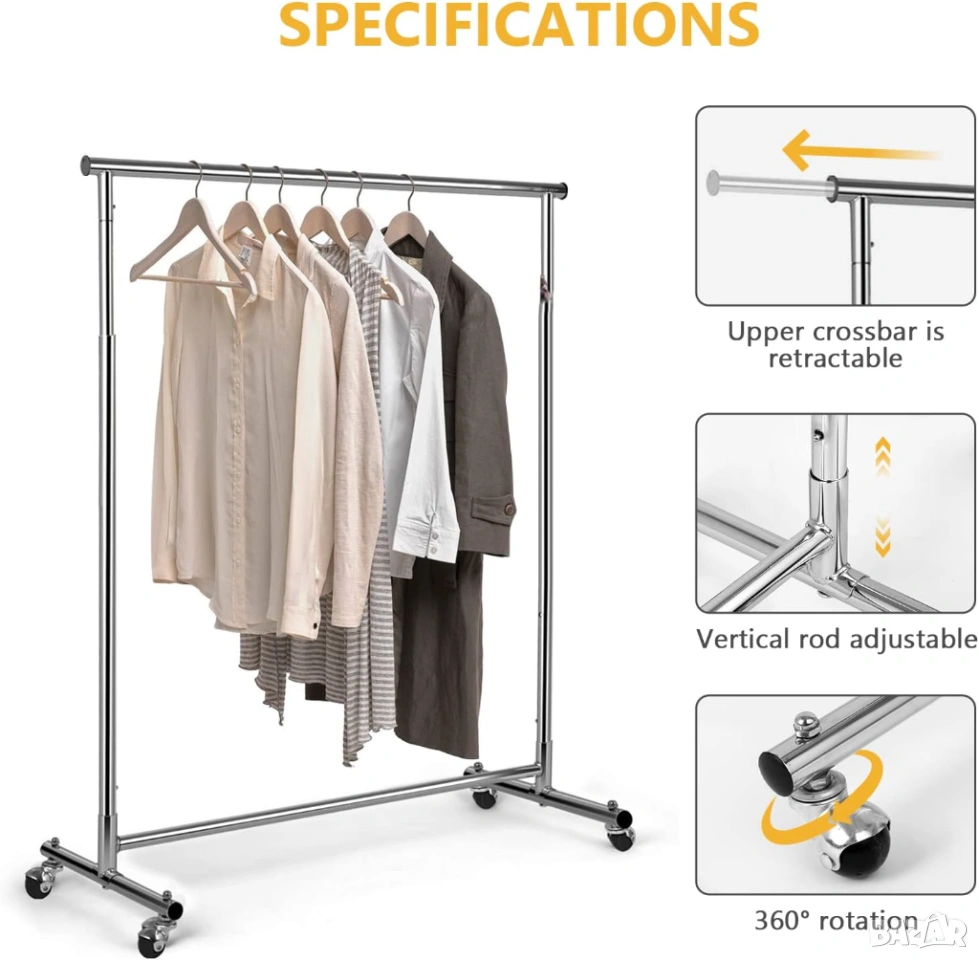 - Регулируемата по височина стойка за дрехи, изработена от висококачествена неръждаема стомана, е здрава и устойчива на корозия. Хромираната метална релса издържа до 100 кг дрехи, а разтегателната релса за дрехи е подходяща както за сухи, така и за мокри дрехи.
