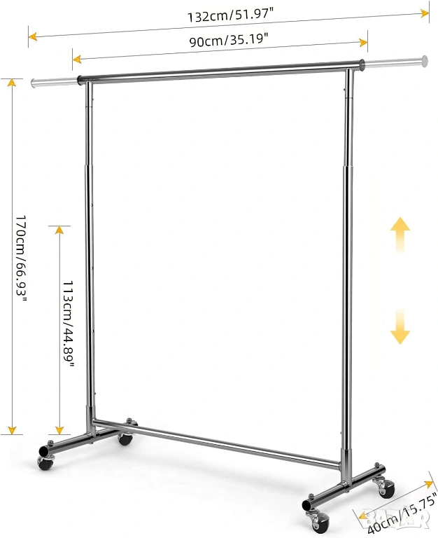 - Височината и ширината на закачалката за дрехи на колелца, много стабилна, могат да се регулират според вашите нужди. Закачалката за дрехи може да се регулира на височина (113 см/132 см/151 см/170 см) и на дължина (90 см/132 см), за да осигури повече място за съхранение на дрехи, без повече намачквания на рокли, якета, дълги палта и други!