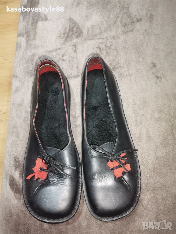 Дамски ежедневни обувки тип "балерини" в черен цвят от естесвена кожа с червен акцент във форма на листо. Те са с гъвкава подметка и ергономичен дизайн. Качествено изработени и комфортни, с шито и ултра гъвкаво ходило за повече здравина. Вътрешността е от естествена кожа и много мека вадеща стелка с дължина 24.4см.Височина отзад 7см.