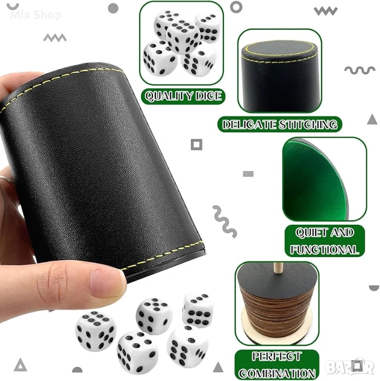 Здрав материал: Приборите Shock са изработени от здрава и висококачествена дървесина. Чашата за зарове е изработена от висококачествена черна кожа, вътрешната стена на чашката е обвита със зелен кадифе, което я прави много добра на допир. Гарантирана е издръжливост и професионално усещане.