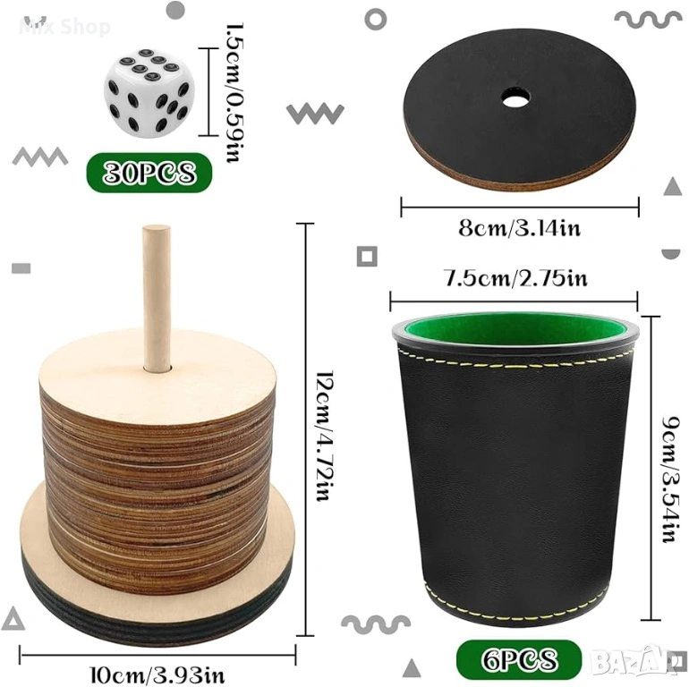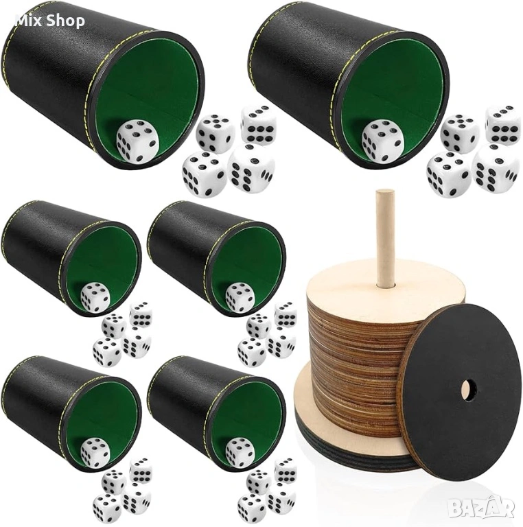 Перфектен комплект: комплектът Shock съдържа дървени прибори Shock, 6 чашки с кубчета и 30 кубчета с кубчета. Комплектът е подходящ както за начинаещи, така и за опитни играчи.
