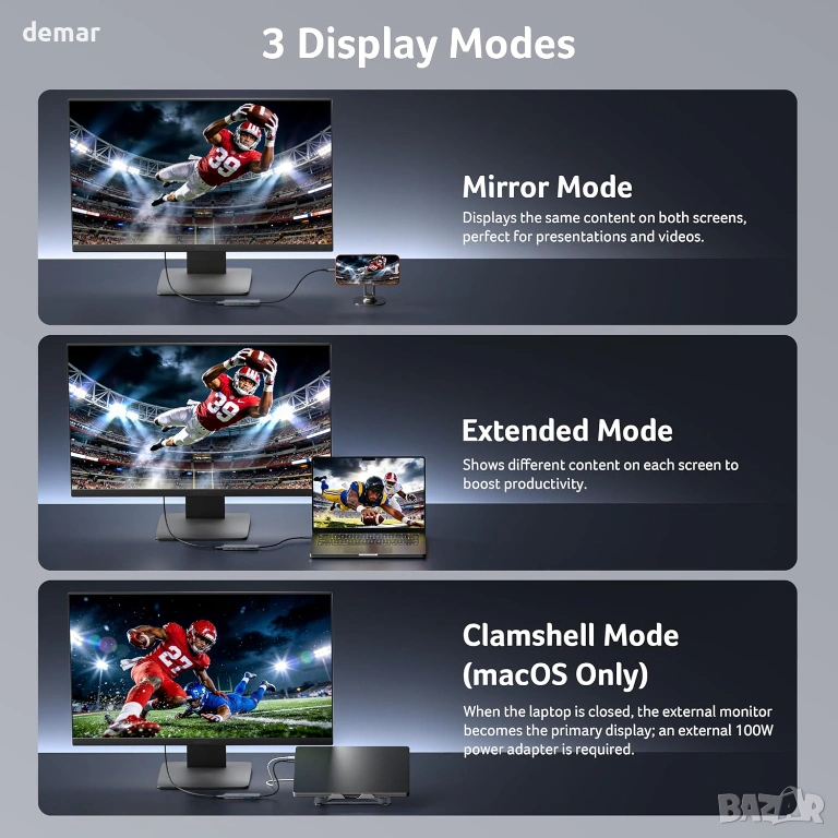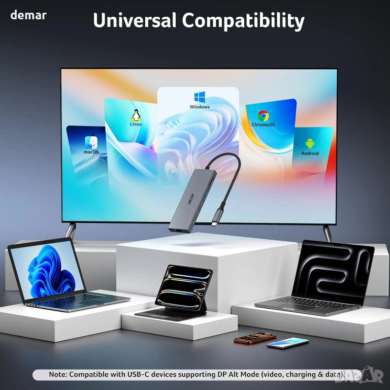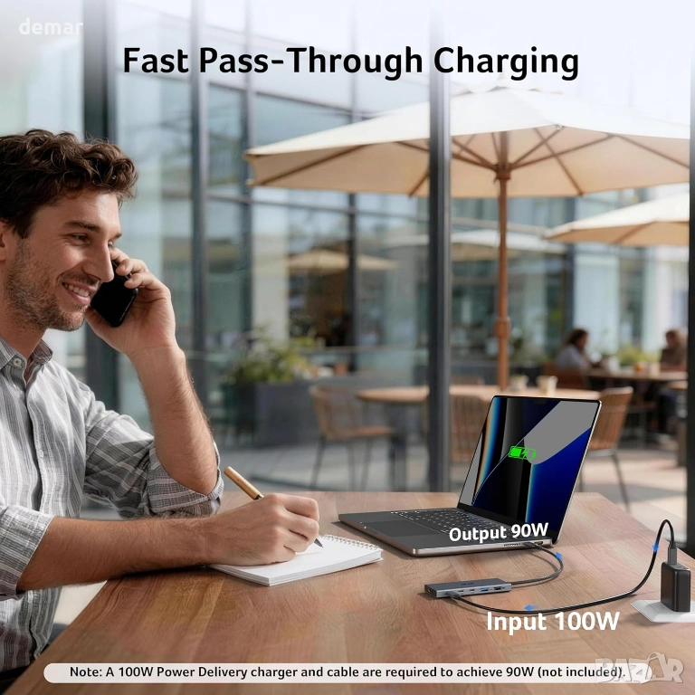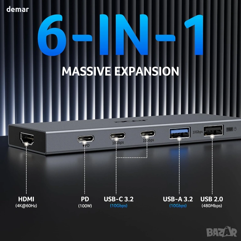Компактен 6-в-1 USB-C хъб разширява един порт в HDMI с 4K@60Hz изход, два високоскоростни USB-C и един USB-A порта, поддържащи пренос на данни до 10Gbps, плюс допълнителен USB-A 2.0 за стабилни периферни връзки, като същевременно позволява до 100W захранване (90W изход) за едновременно бързо зареждане и надеждна работа; проектиран за ефективна многозадачност, той поддържа дисплей, данни и захранване чрез една връзка и е съвместим с широка гама от USB-C устройства, които поддържат DisplayPort Alt Mode.