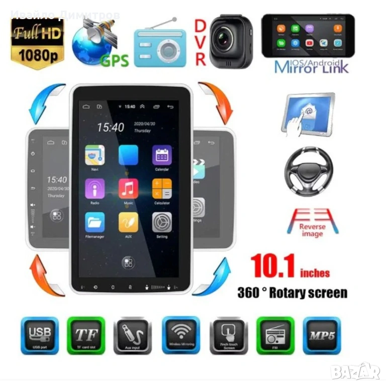 Автомобилна мултимедия с Android 11, 10.1" ротационен екран, GPS, Bluetooth, WiFi, DVR и камера за заден ход