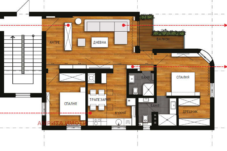 Жилището е с площ от 90 кв.м. и има функционално разпределение: антре, дневна, кухня с трапезария, две спални, две бани с тоалетни, дрешник и балкон. Голямо предимство е четиристранното изложение дневната и едната спалня са ориентирани на юг и изток, което ги прави изключително светли, а втората спалня гледа на север и запад.