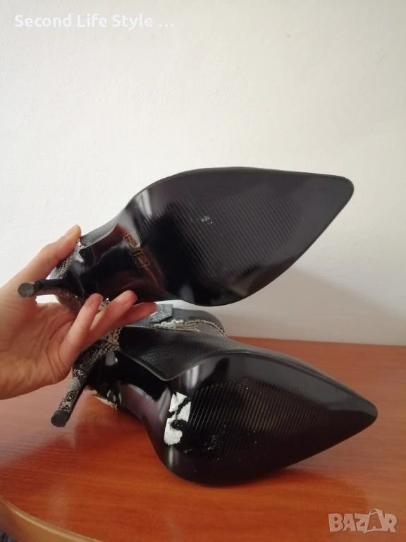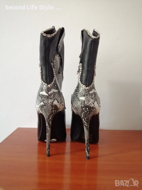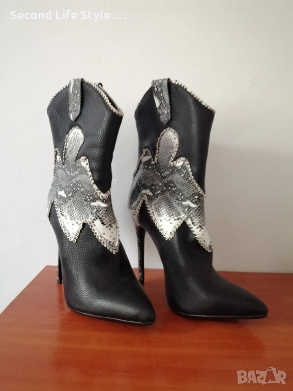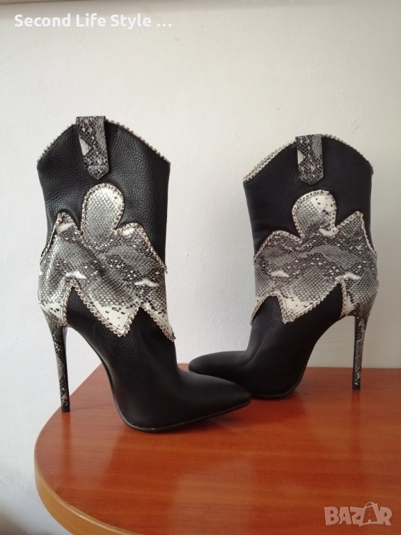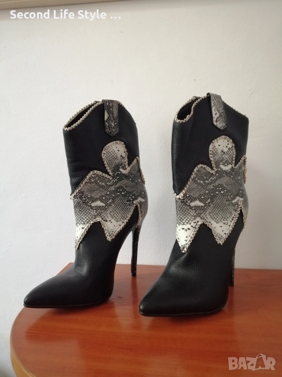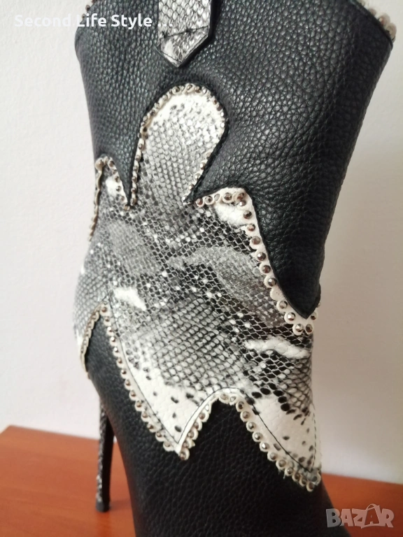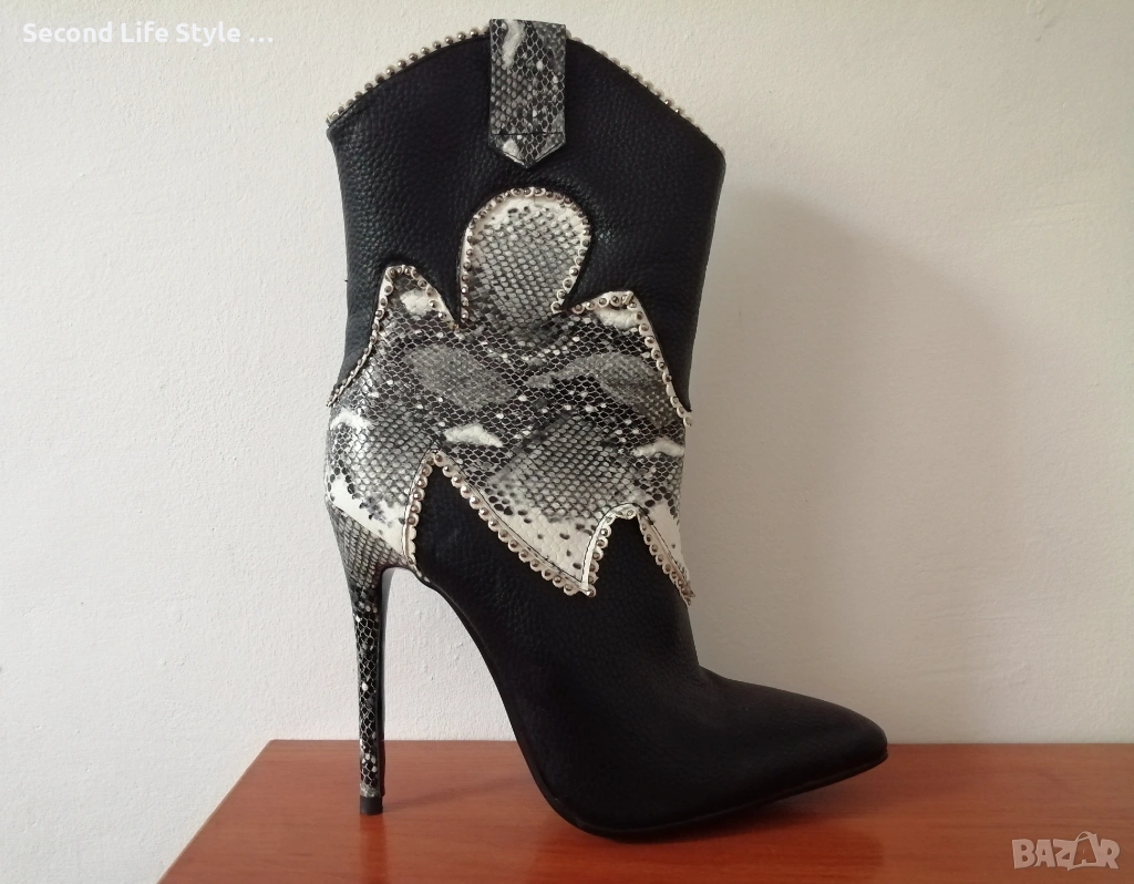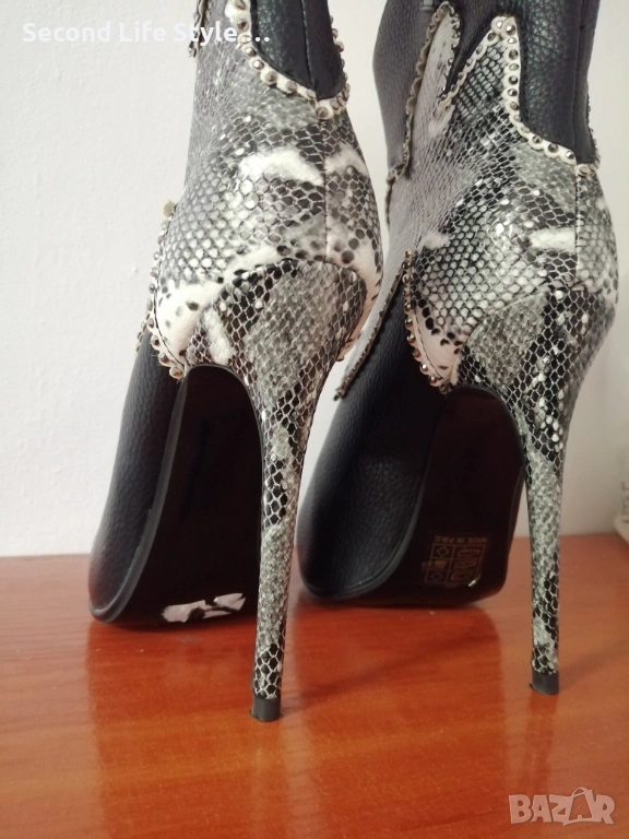 №36 дамски кожени боти ботуши със змийска кожа и кристали, висок тънък ток и остър връх