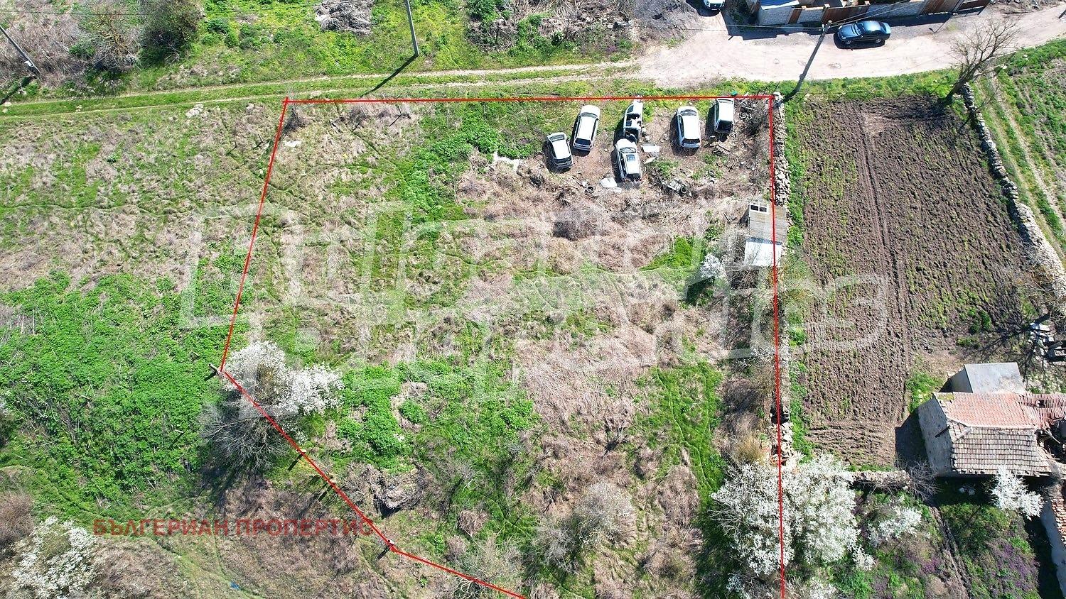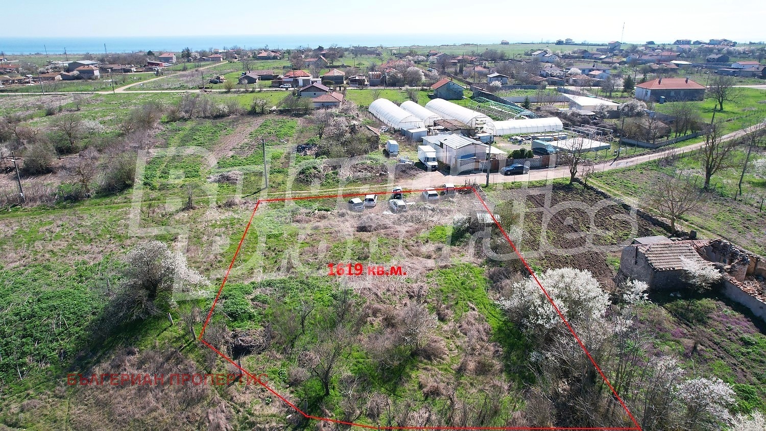 Имотът е с площ от 1619 кв.м и разполага с лице на път от 43 метра, което осигурява отлични възможности за застрояване и достъп.