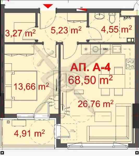 РАЗПРЕДЕЛЕНИЕ: Жилището разполага с площ от 80 кв.м., разгърната в следното функционално разпределение: хол с кухненски бокс, спалня, баня и тоалетна, мокро помещение.