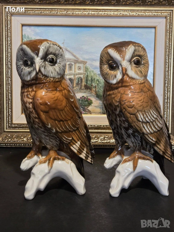 Всяко перо е прецизно моделирано, а живият поглед на совите е постигнат чрез деликатно подглазурно оцветяване в естествени тонове.
