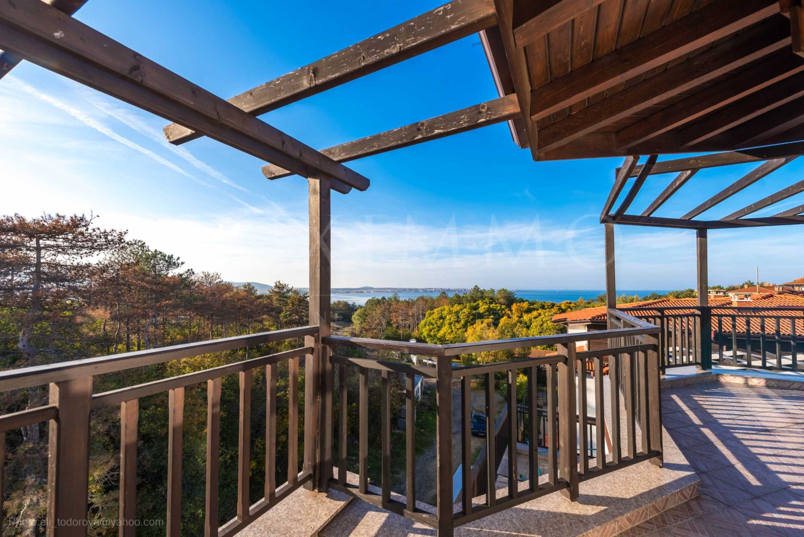 Имотът се намира на 4-ти етаж и се състои от коридор, дневна с кухненски бокс, 2 спални, 2 комбинирани бани с тоалет, голяма панорамна тераса от 53.6 кв.м, с фронтална гледка към боровата гора, красивия залив и плаж, към хоризонта към морето.