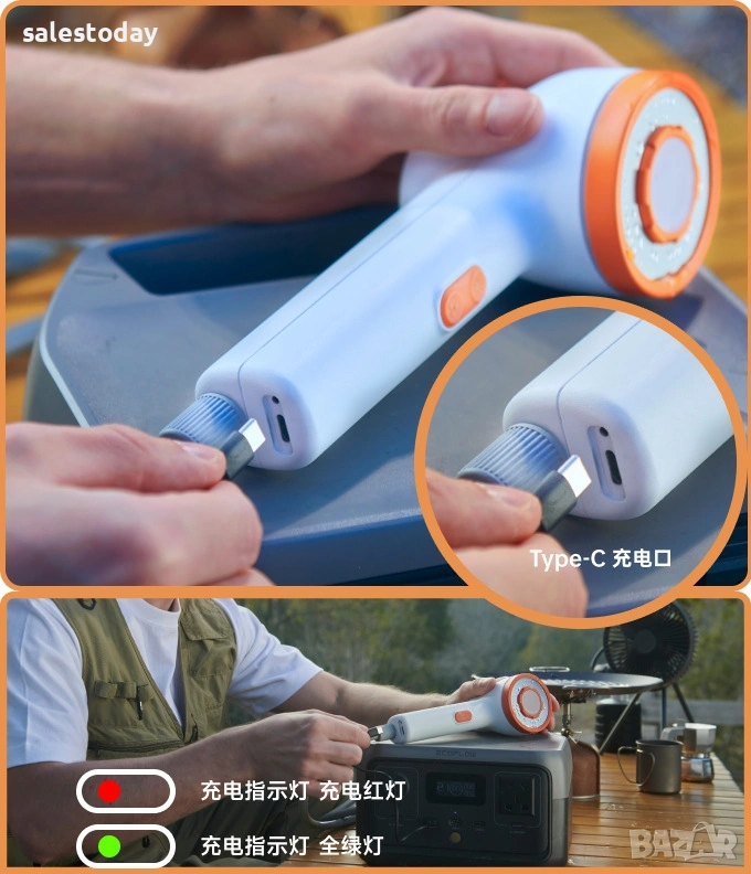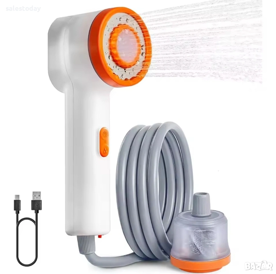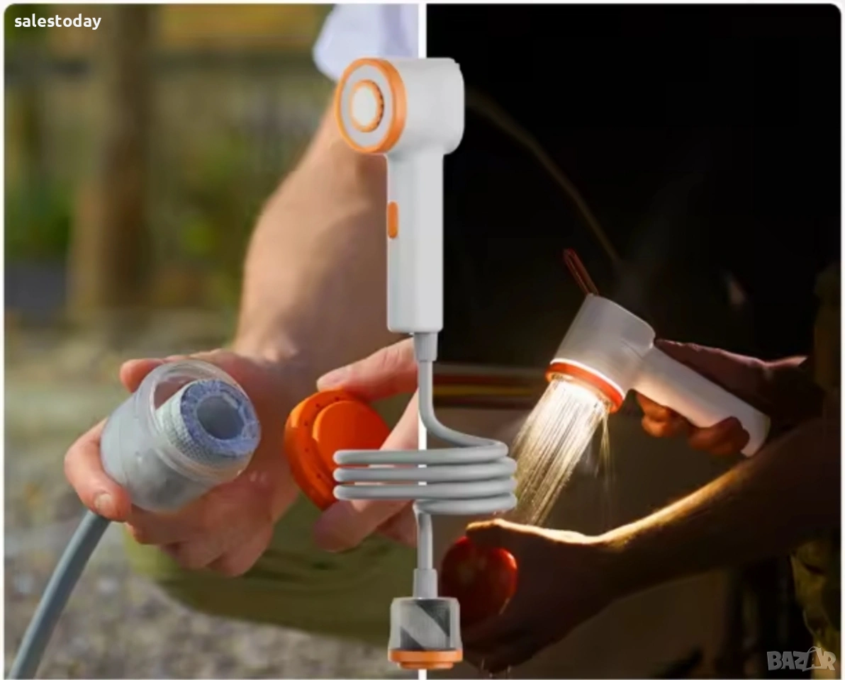 Преносен душ за баня, кухня или балкон. Практичен и удобен за използване, лесен за монтаж. Идеален за къщи, апартаменти или офиси без постоянен достъп до вода. Подходящ за бързо и лесно измиване на ръце, коса или тяло. Преносимият къмпинг душ е практично решение за поддържане на хигиена по време на пътувания и престой сред природата. Подходящ е за къмпинг, каравани, плаж, риболов, планински преходи или дълги пътувания с автомобил. Компактният му размер и леката конструкция позволяват лесно пренасяне, а работата с акумулаторна батерия го прави удобен за използване навсякъде, дори когато няма достъп до електричество. код1195 Допълнително удобство е LED осветлението, което позволява използване на душа при слаба светлина или през нощта. Това е особено полезно при къмпинг или престой на места без осветление. Устройството разполага с вградена батерия с капацитет 2500 mAh, която осигурява продължителна работа с едно зареждане. Зареждането става чрез стандартен USB кабел, което позволява захранване от външна батерия, автомобилно зарядно или лаптоп. Функции: водна филтрация и LED осветление Батерия: 3.7V 2500 mAh литиева батерия Време за зареждане: около 2.5 часа Работно време: първа степен – до 90 минути втора степен – до 70 минути Дебит на водата: около 1.2 L/min (ниска степен) и 1.7–2 L/min (висока степен) Захранване: USB 5V – 1A Материал: ABS пластмаса и силикон Размери: приблизително 74 × 86 × 232 мм Тегло: около 330 г (без вода), помпа около 190 гМоделът разполага с два режима на водната струя.