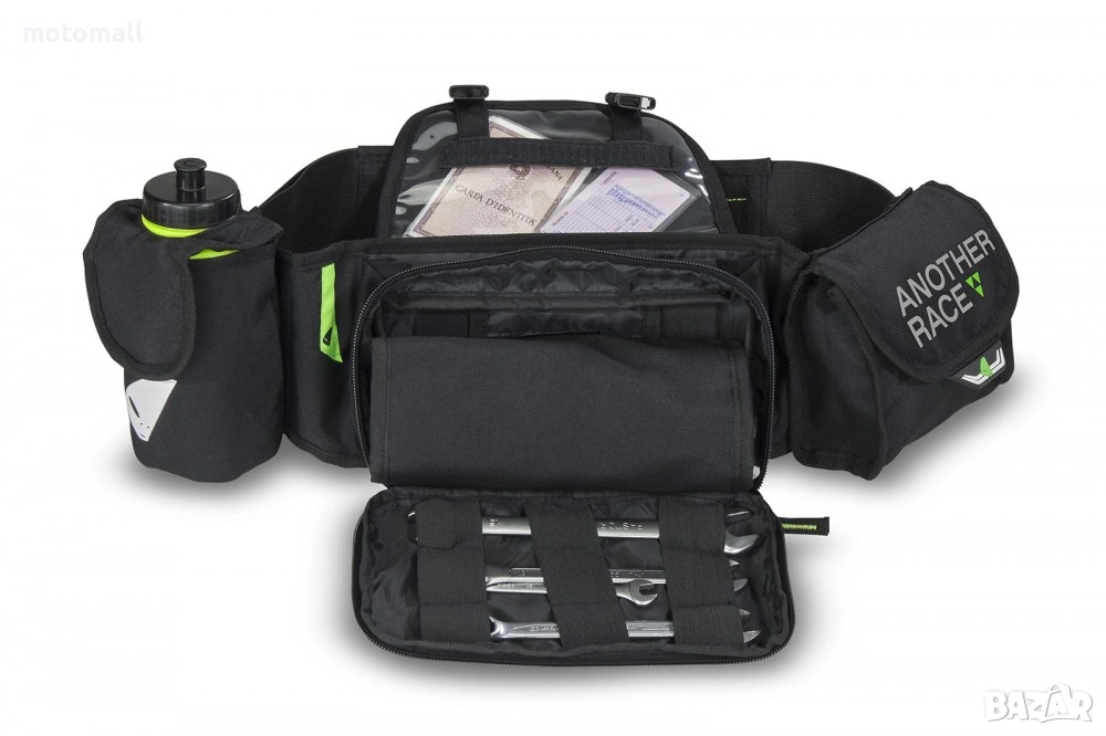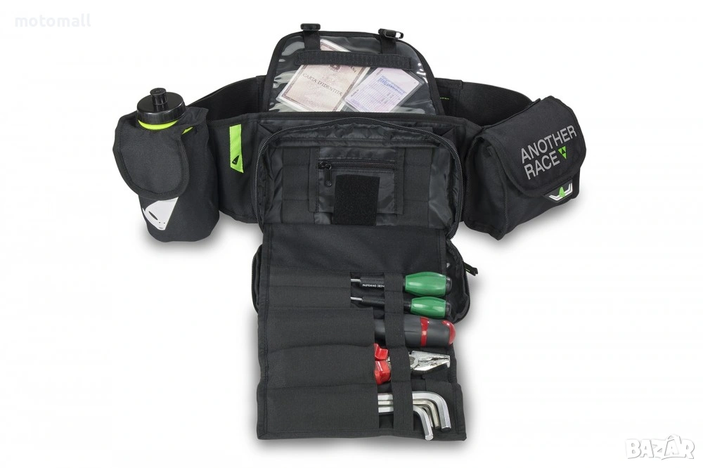 чанта, изработена от найлонов плат, снабдена е с джоб за бутилка вода и бутилка вода от 500 ML, централен джоб за държач за инструменти - забележка: инструментите не са включени - за справяне с всякакви неочаквани събития и допълнителен голям джоб за предмети.