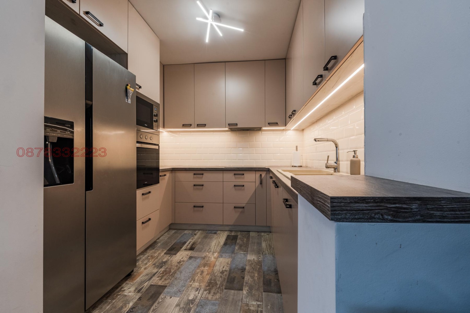 - Оборудвана кухня (хладилник с ледогенератор и фризер, фурна, микровълнова, керамичен плот, кана за гореща вода, тостер, съдомиялна, кафеавтомат, диспенсър за вода, посуда и прибори);