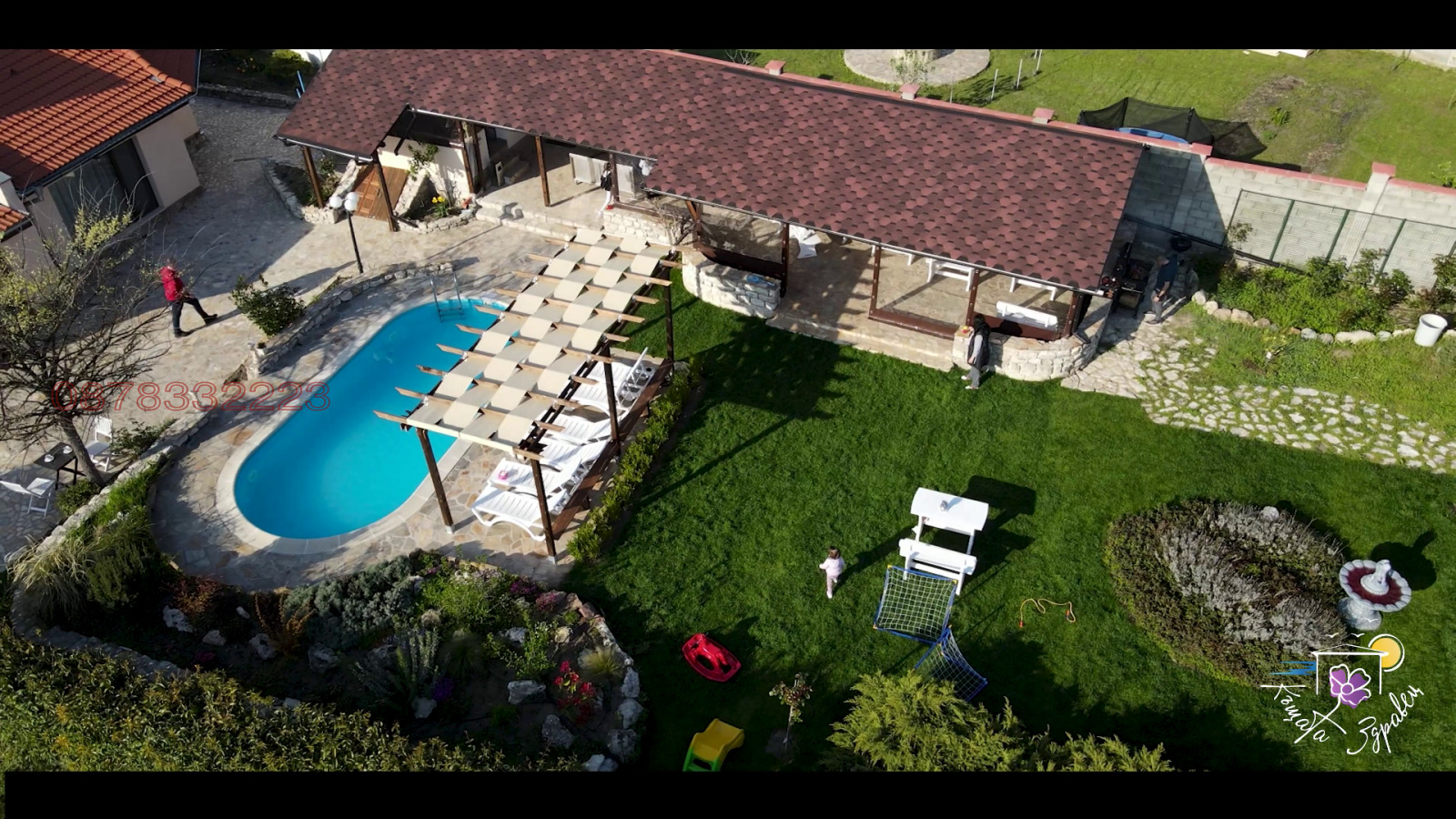 Нашата красива и уютна къща с басейн и прекрасно озеленен голям двор, само на 15 км от Варна, разполага с просторна дневня,кухня,трапезария и три спални помещения на първи етаж , апартамент на втори етаж.Общо 5 санитарни помещения.Голяма лятна кухня,гараж и голям прекрасно озеленен двор с много забавления за деца и възрастни.