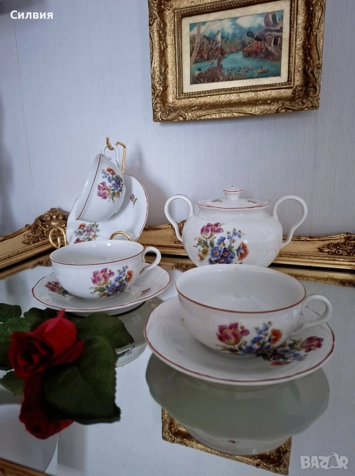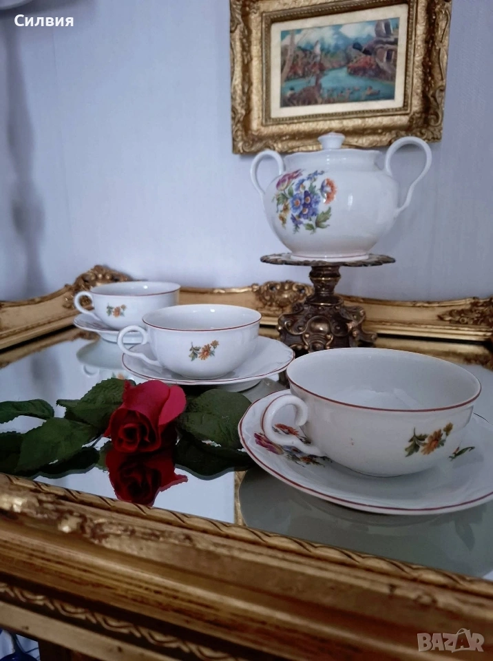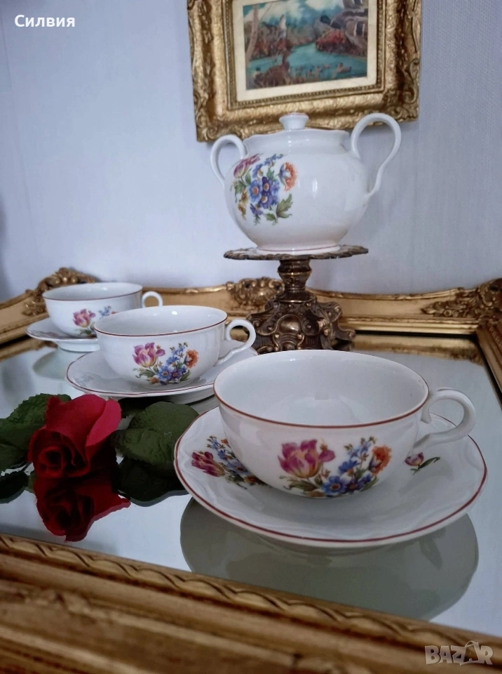 🌹 Ретро изящество от порцелан Сервиз „Цветна градина“ – СИП 🌹 Красив и автентичен комплект от фин български порцелан, произведен от СИП. Със своята класическа визия и нежни флорални мотиви, тези съдове носят усещане за уют, аристократизъм и непреходна естетика. Комплектът включва: 3 чаши 3 чинийки 1 голяма захарница Всяка чаша е малко произведение на изкуството с различен флорален мотив от двете страни, което позволява да им се любувате от всеки ъгъл. ●Вместимост на чашите: 220 мл – идеален обем за вашето сутрешно кафе, следобеден чай или горещ шоколад. ●Диаметър на чинийките: 15 см – с нежно вълнообразен кант, който допълва елегантността на чашите. ●Впечатляваща захарница. Голяма и величествена, с вместимост около 700 мл. Тя е истински акцент на масата, подходяща както за захар, така и за съхранение на дребни сладки или бонбони. Маркировка: Автентичен печат на дъното (СИП), гарантиращ произхода и колекционерската стойност. Сервизът е много добре запазен, с минимални следи от времето, които само подчертават неговия ретро характер. Порцеланът е чист, цветовете са наситени, а глазурата е със запазен гланц. Този комплект е прекрасен избор за ценители и колекционери на български антикварен порцелан. Цена 6️⃣5️⃣€ 127,13лв 🌹..•´¨) ¸.•¨) 🌱... (¸.•¨¯`*•.🍃🌹🍃