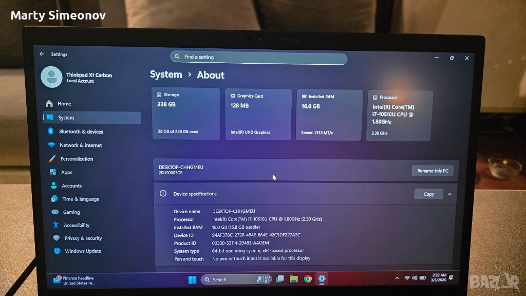 Lenovo Thinkpad X1 Carbon i7-10510U 16GB RAM → Обява 54220099