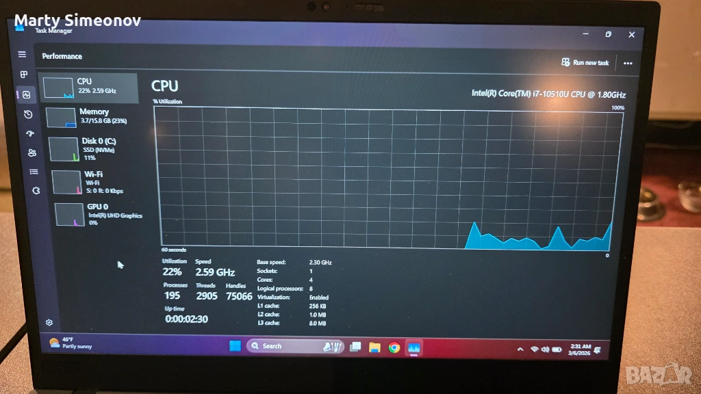 Processor: 10th Gen Intel Core i7-10510U (4 cores, 8 threads, 1.8 GHz base up to 4.9 GHz Turbo).