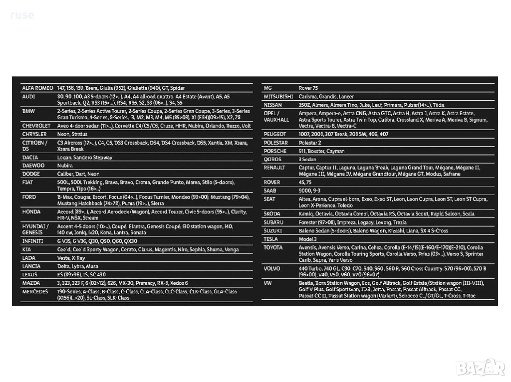 *Списъкът на моделите автомобили не е изчерпателен!