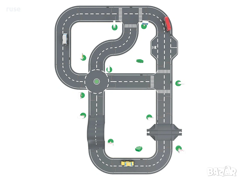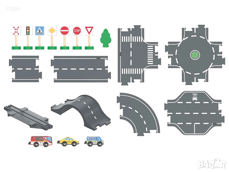 - Множество аксесоари: 3 превозни средства (такси, пожарна и полиция), 8 пътни зноко и 2 светофора