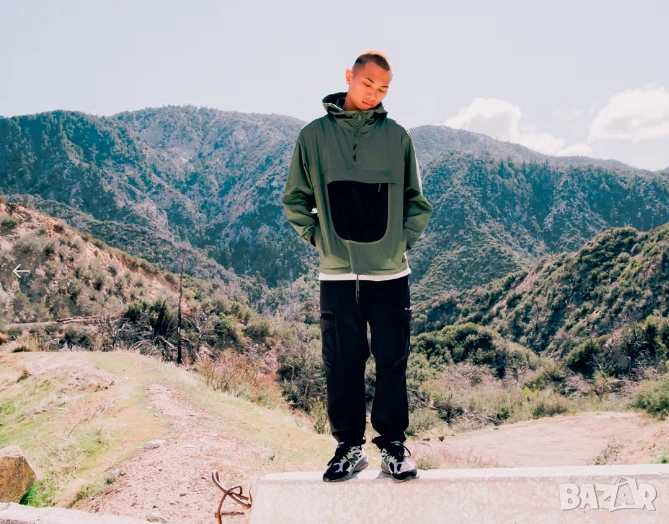 Дизайн: Якето е тип анорак (pullover) с половин цип и качулка, която се регулира с връзки.