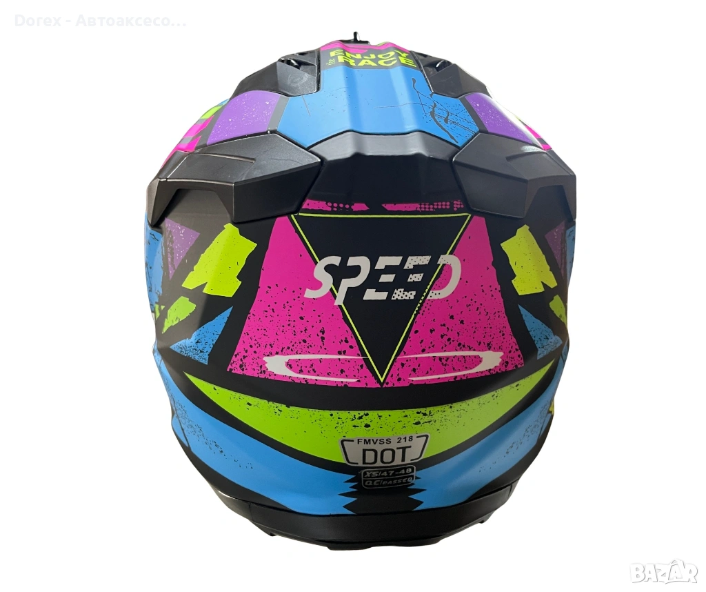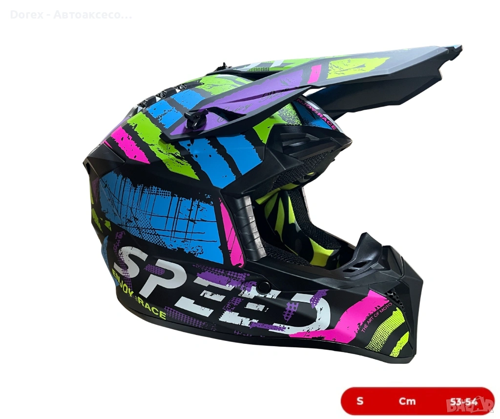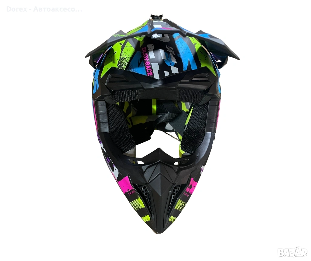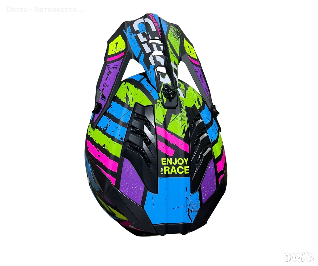 Модерният агресивен дизайн в бял цвят в черен цвят с неоново многоцветни елементи осигурява отлична видимост и спортна визия.