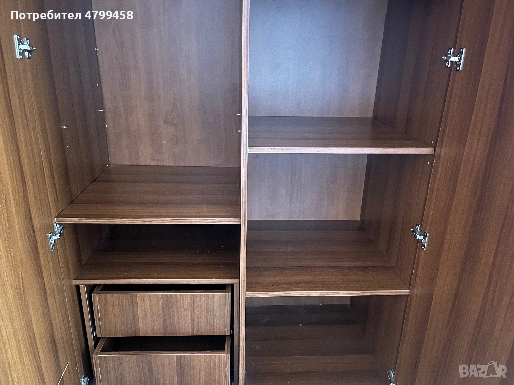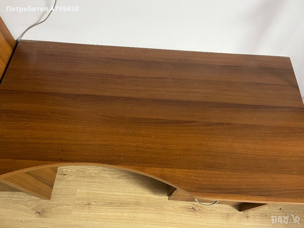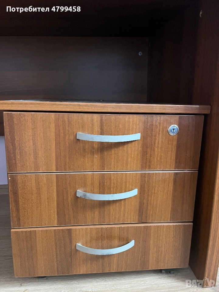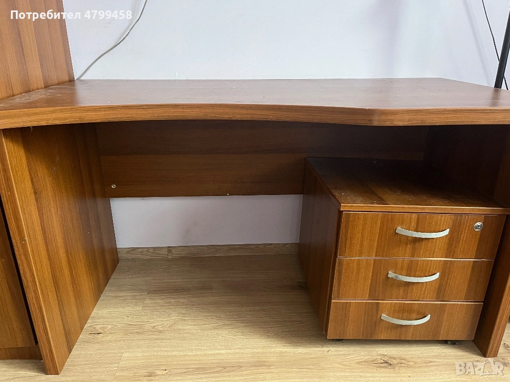 Към него има отелен шкаф с чекмеджета, който може да се мести според нуждите. Единствената забележка е счупена ключалка на горното чекмедже и заяждането му ,което не пречи на използването му .