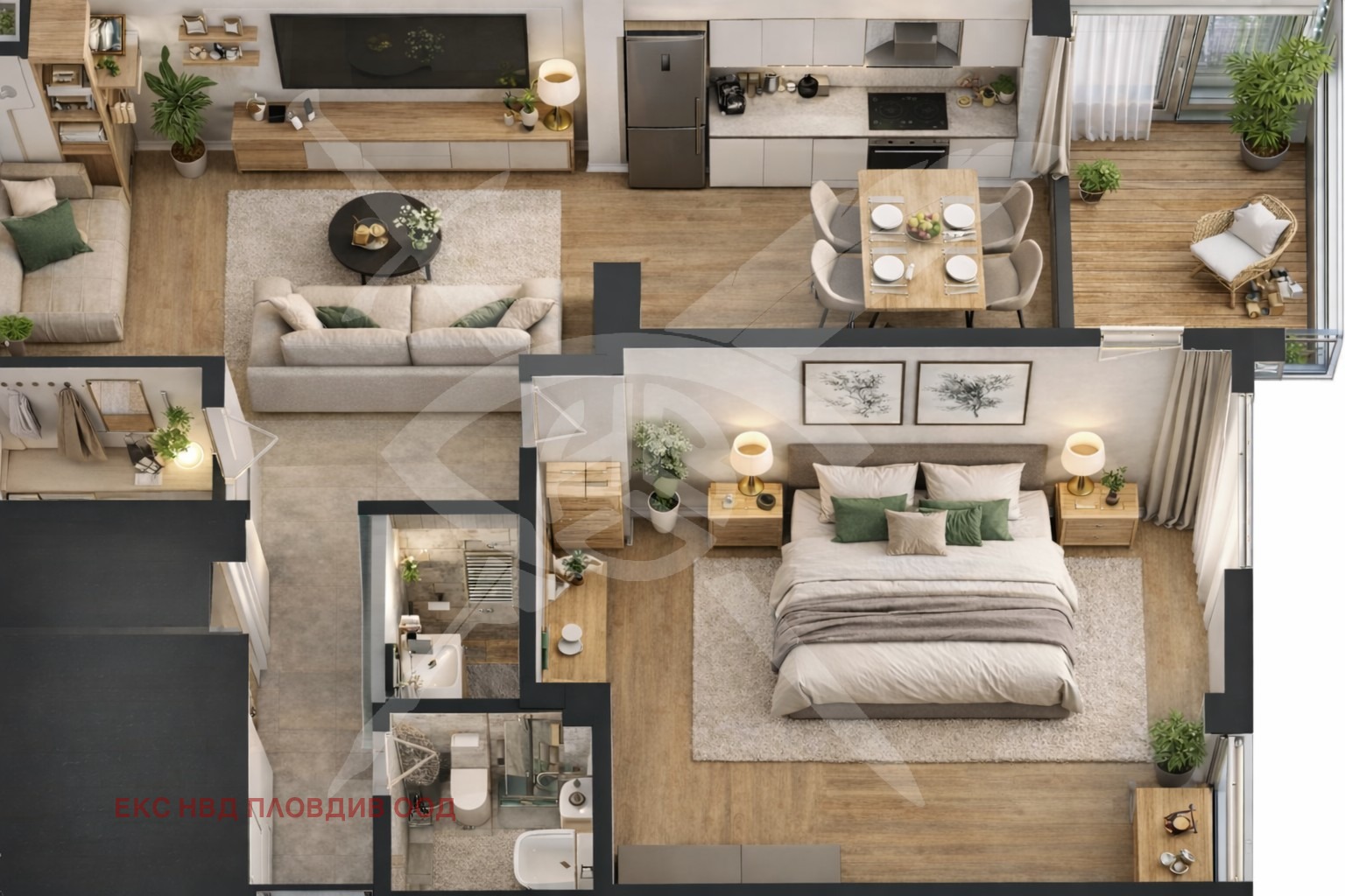 РАЗПРЕДЕЛЕНИЕ: Жилището се разгръща върху 71 кв.м., внимателно организирани в хармонично съчетание от светъл дневен кът с кухненски бокс, спалня, баня с тоалетна и тераса, която отваря пространство за глътка въздух и спокойствие.