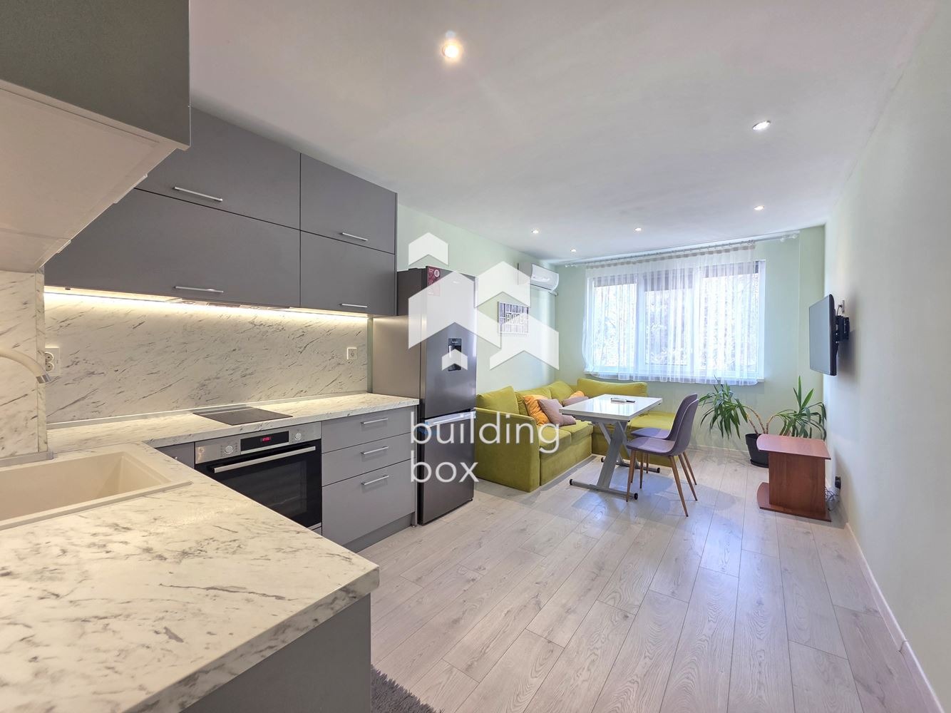 Местоположение: Апартаментът се намира на пешеходно разстояние от градски транспорт, супермаркети, училища и детски площадки.