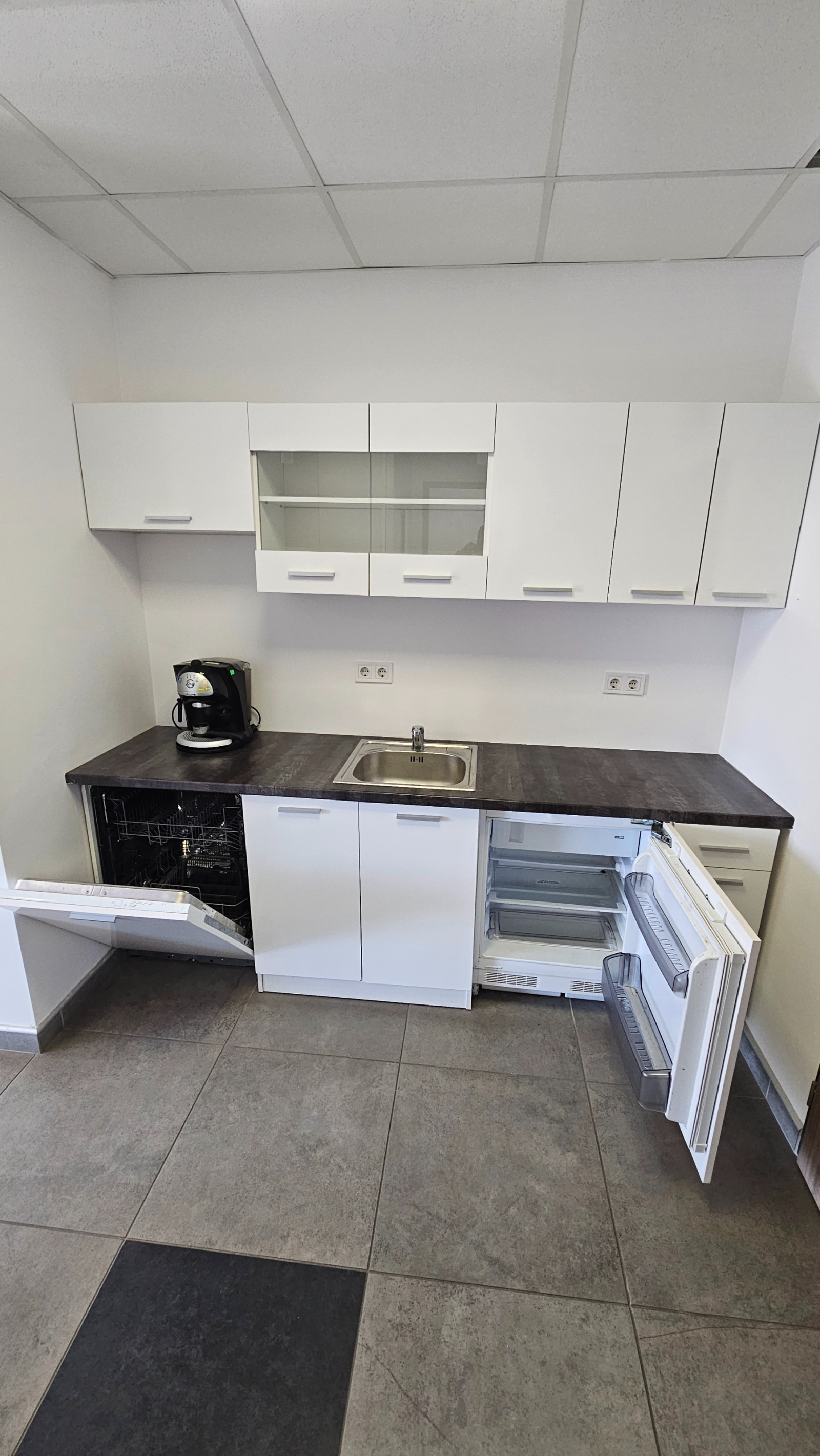 кухненски кът с мивка, хладилник, миялна машина,микровълнова фурна, шкафчета