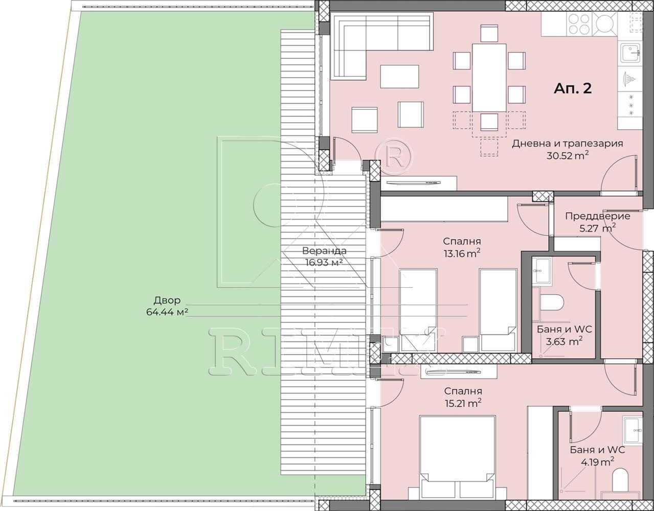 Представяме ви изключително функционален и уютен тристаен апартамент на партерно ниво с площ от 96 кв.м, съчетаващ комфорт, простор и директна връзка с природата.