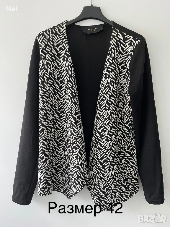 *Сако тип жакет без подплата, мярка 42- Reserved. Предницата се прихлупва, с удължени триъгълни краища. Гърбът и ръкавите са чисто черни. Материал- полиестер, вискоза, еластан. -4€