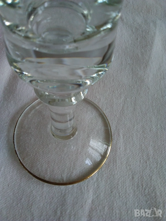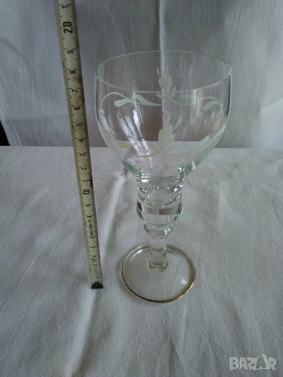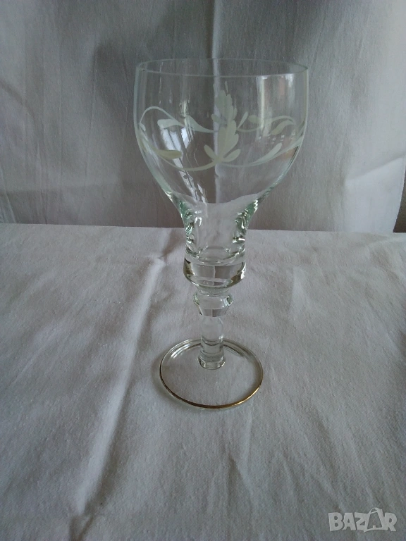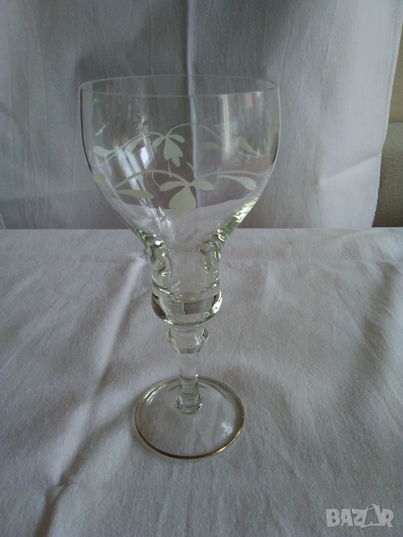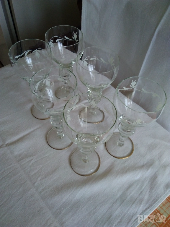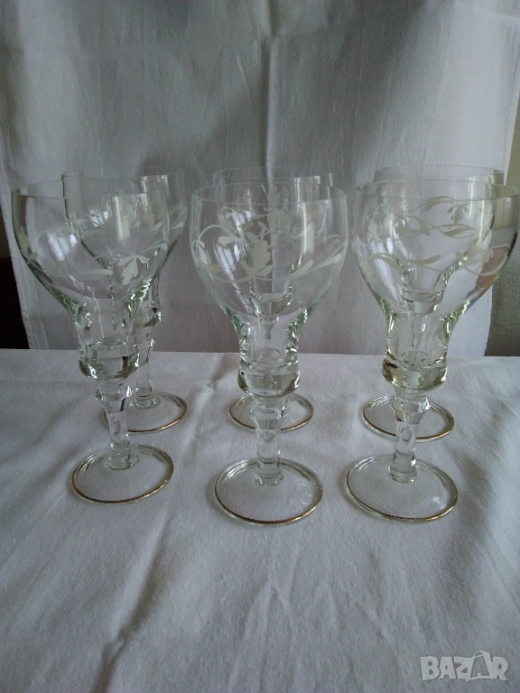 Продавам стъклени ръчно рисувани чаши за вино от 70-те години на 20 век. Висок стол, златен кант по столчето, ръчно рисувана декорация с бели флорални орнаменти. Височина-18 см., цената е за бройка-3 евро, налични 17 бр., продават се на комплект от по 6, 8 или нацяло. Отлично състояние.