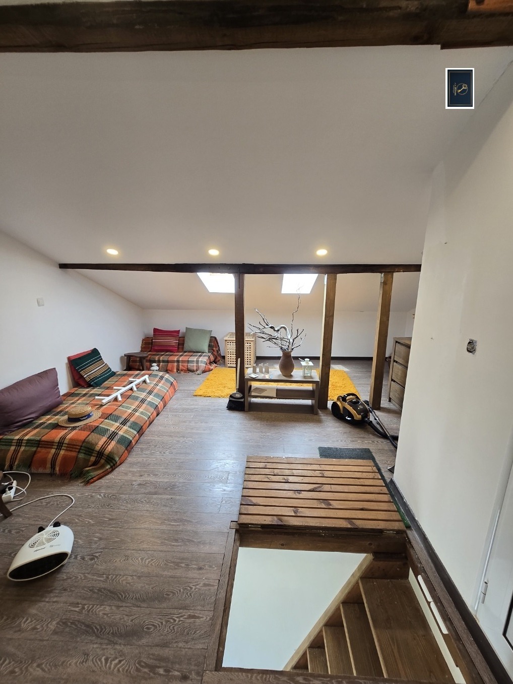 Трети етаж: Отворено пространство с втора спалня, комфортен кът за релакс и самостоятелна баня с тоалетна.