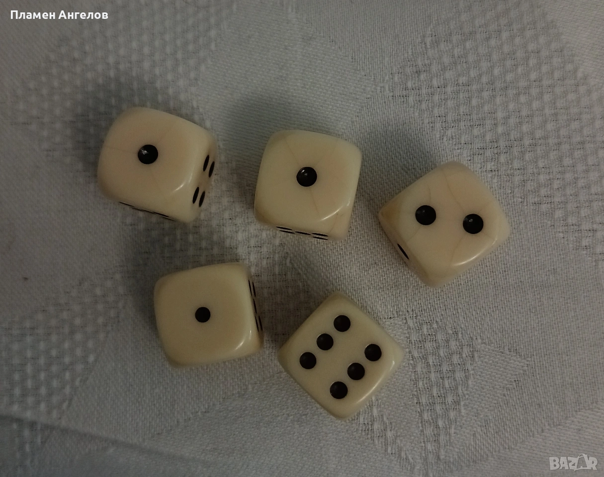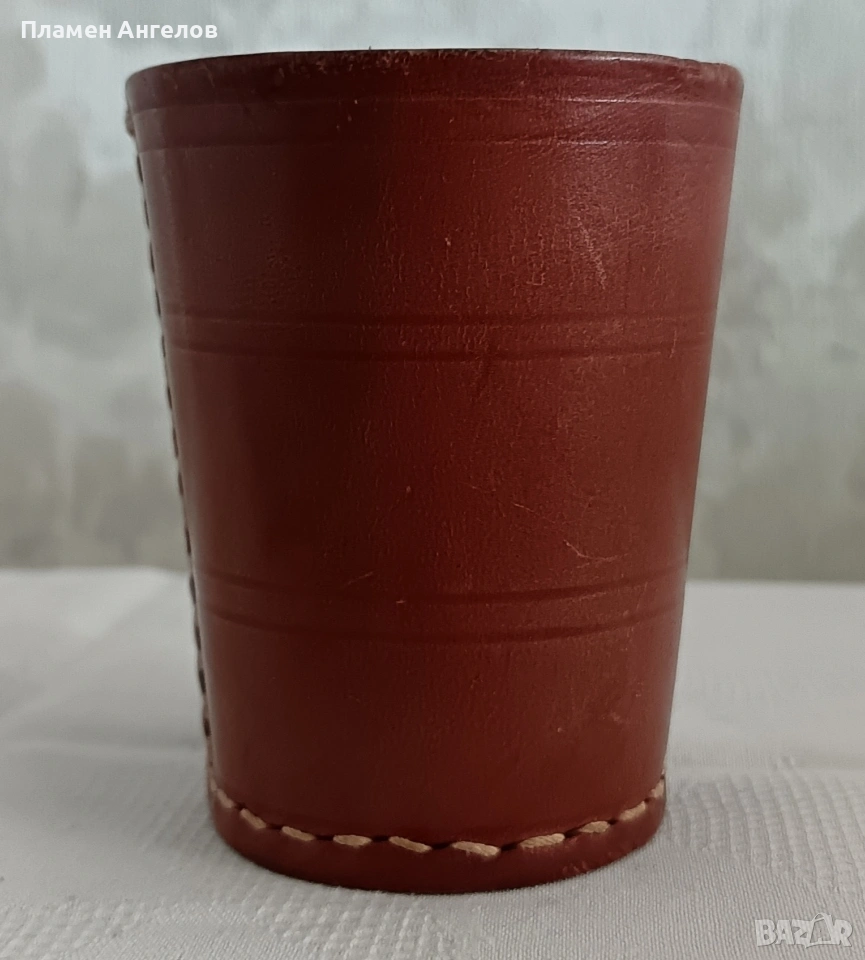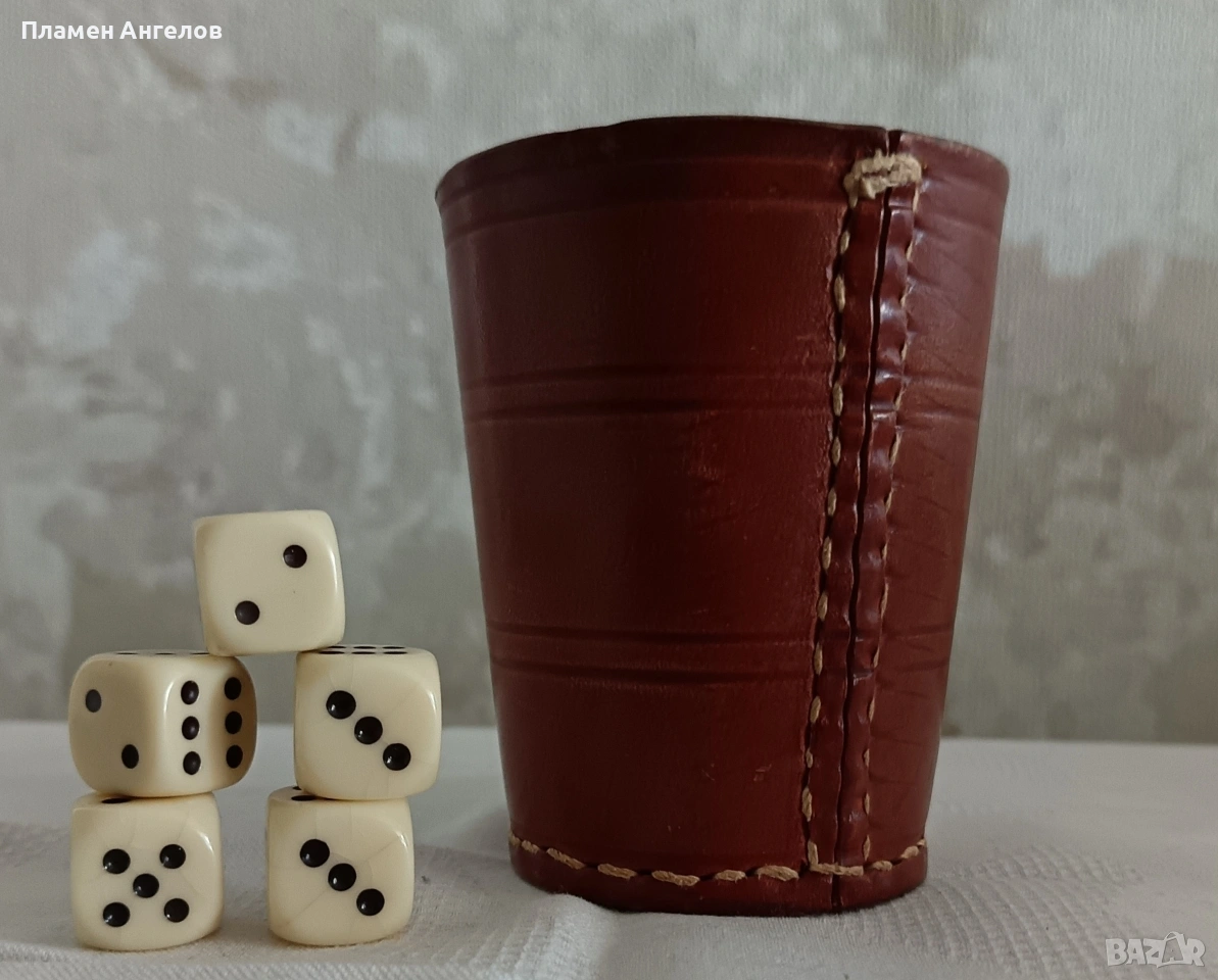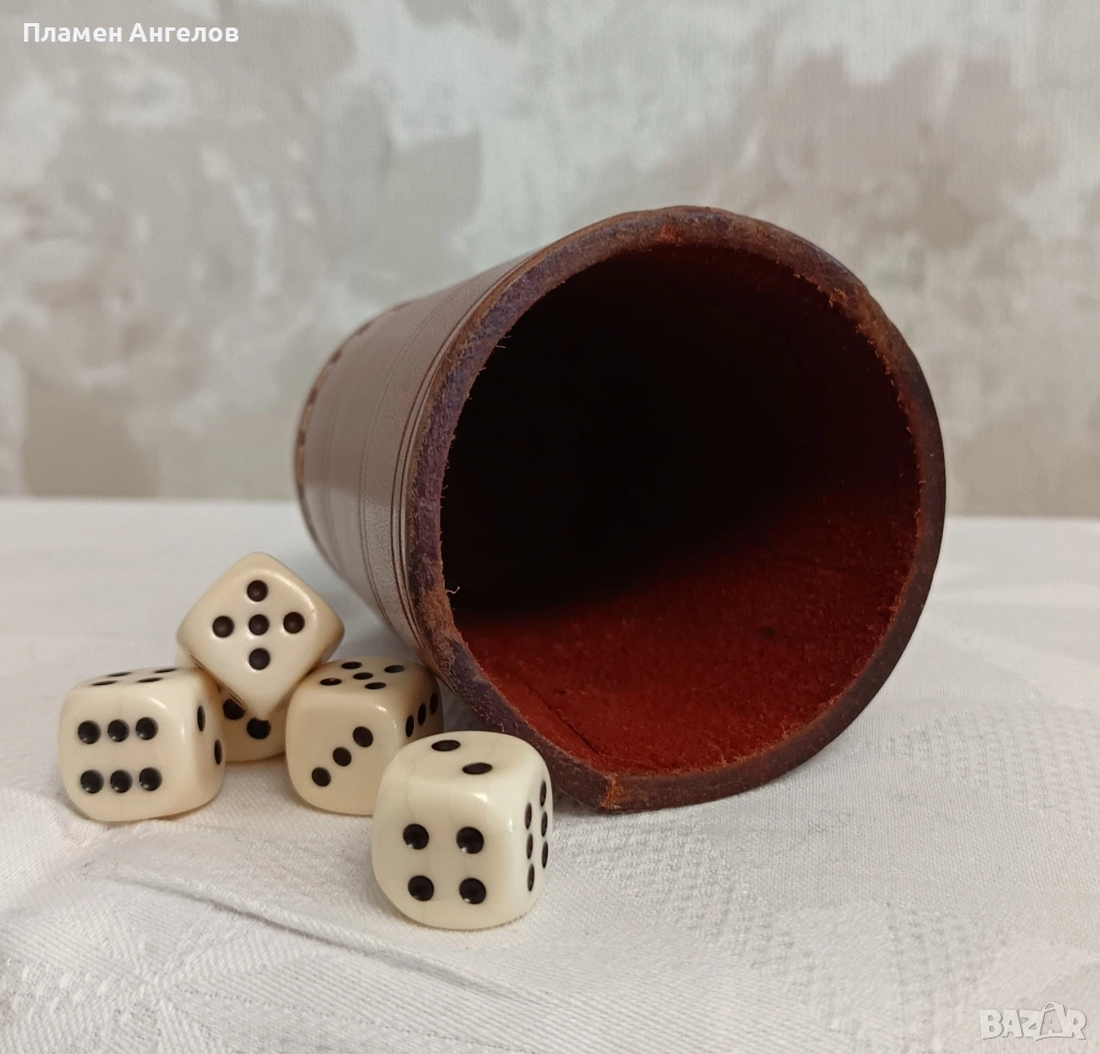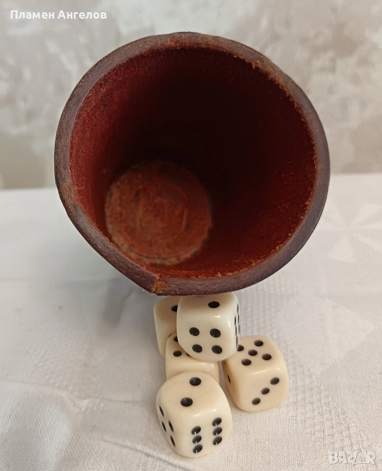 Комплект за барбут със чаша и 5 броя костни зарове със характерен цвят и звънлив звук. Чашата е от дебела, естествена телешка кожа. Ръчно изработена, ръбовете добре пасват, без застъпвания. Здрава не се угъва. Дебелина на кожата5мм. Висока 9см.и диаметър ветрешен 6.5см. Стари костни зарове.